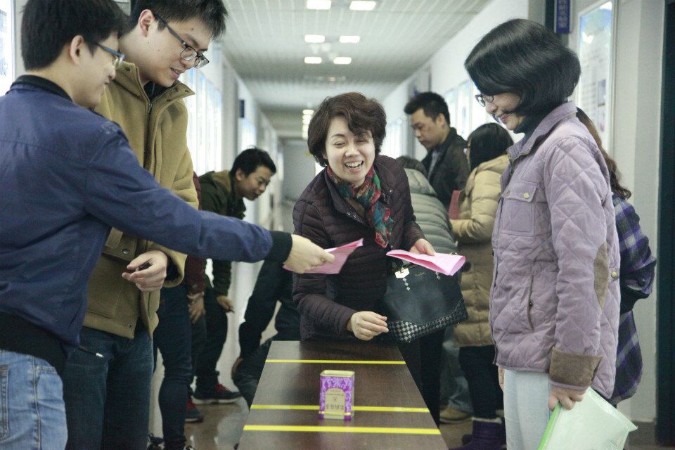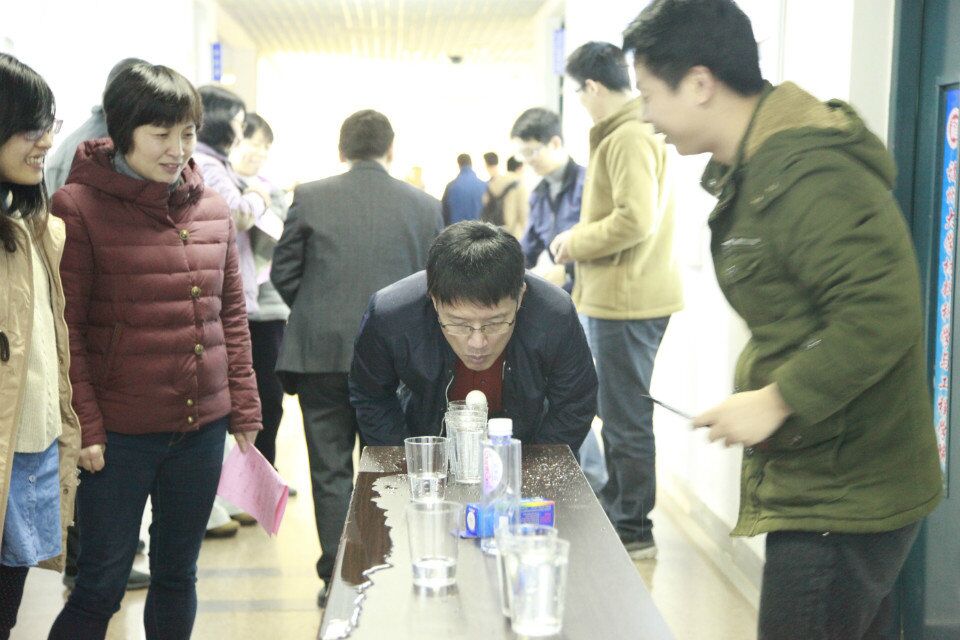 活动现场设有5项游戏:百发百中、过犹不及、步步为营、小李飞镖、幸运沙包。教师们参与热情高涨,每个项目旁边除了工作人员、还有费力“指导”、加油鼓劲的老师。在过犹不及项目中,要求游戏者站在桌子一端,手不能超过规定区域用手推杯子,使其往另一端运动,以杯子停在中奖区域为获胜。教务处处长、原成人动漫 副院长于岩教授顺利过关。唐电教授在表演吹乒乓球游戏,告诉其他老师游戏过关的经验。“通过啦!”成功的老师都忍不住欢呼起来。活动现场的每一个项目,老师们都玩得不亦乐乎,脸上洋溢着快乐的笑容。