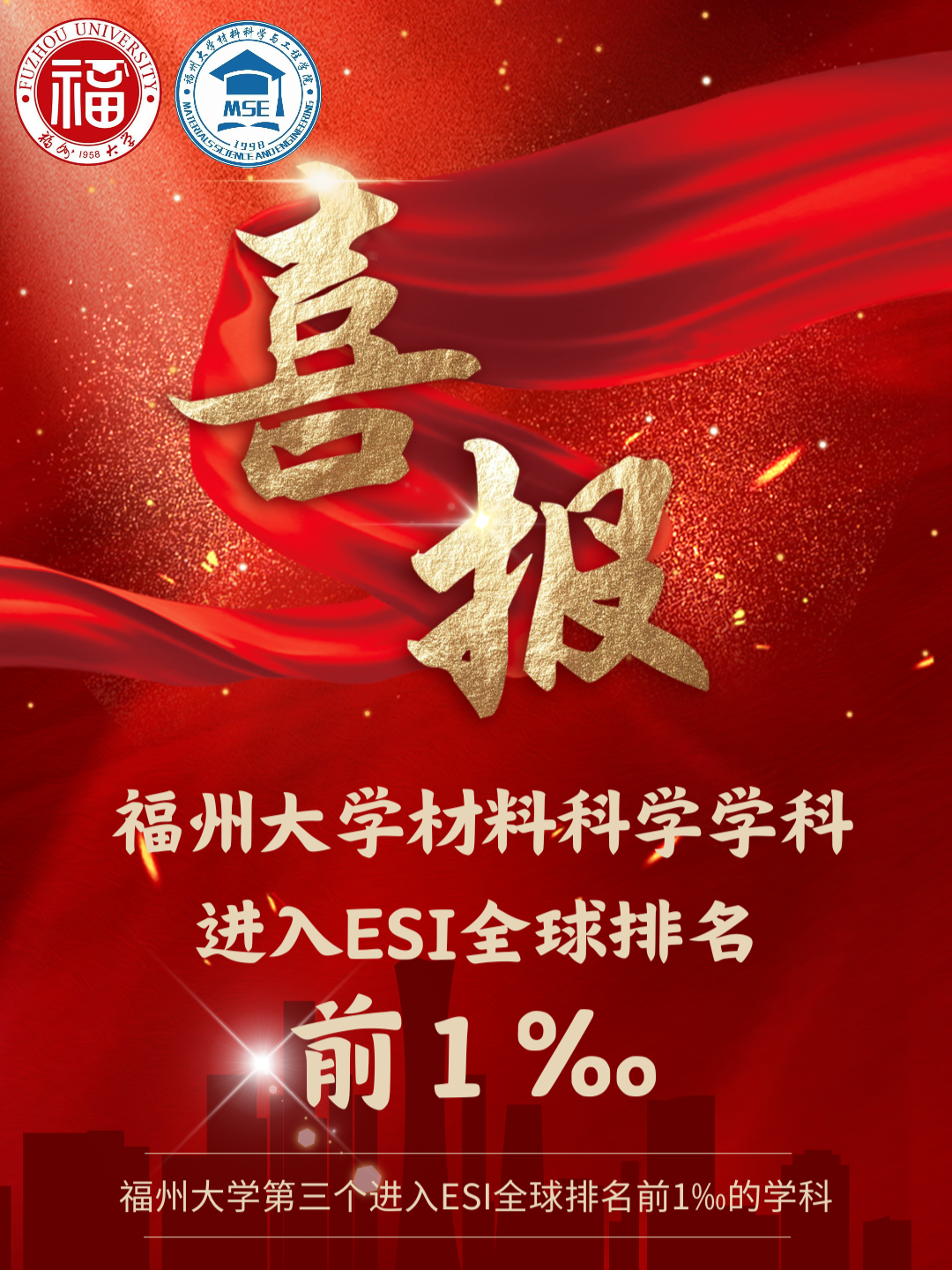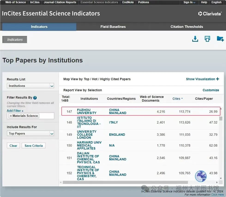 2024年11月14日,科睿唯安更新了ESI数据(2024年第6次更新,含10年8个月的收录论文及其引文信息)。此次数据涵盖的时间范围为2014年01月01日-2024年08月31日。数据显示:成人动漫 材料科学学科首次进入ESI全球前千分之一行列,全球排名147名,全球共有1485个机构进入该学科前百分之一,成人动漫 所处千分位为0.989‰。这是成人动漫 第一个进入ESI全球排名前千分之一的学科,说明成人动漫 学科建设取得阶段性成果。