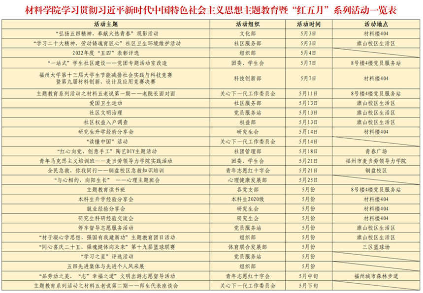 五月花海飘拂馨香,五月青春热情飞扬。忆往昔,先烈写下壮丽的红色史诗,走过筚路蓝缕的万里长征。看今朝,我辈彰显辉煌的中国奇迹,赢得了震古烁今的政通人和。在这生机勃勃的五月,为引导材料学子深入学习贯彻习近平新时代中国特色社会主义思想,牢牢把握“学思想、强党性、重实践、建新功”的总要求,不忘初心,牢记使命,在火红的五月中绽放青春之花,在材料强国领域展现青年担当,成人动漫 特组织开展学习贯彻习近平新时代中国特色社会主义思想主题教育系列活动。接下来,让我们一起看看有哪些主题教育系列活动吧!