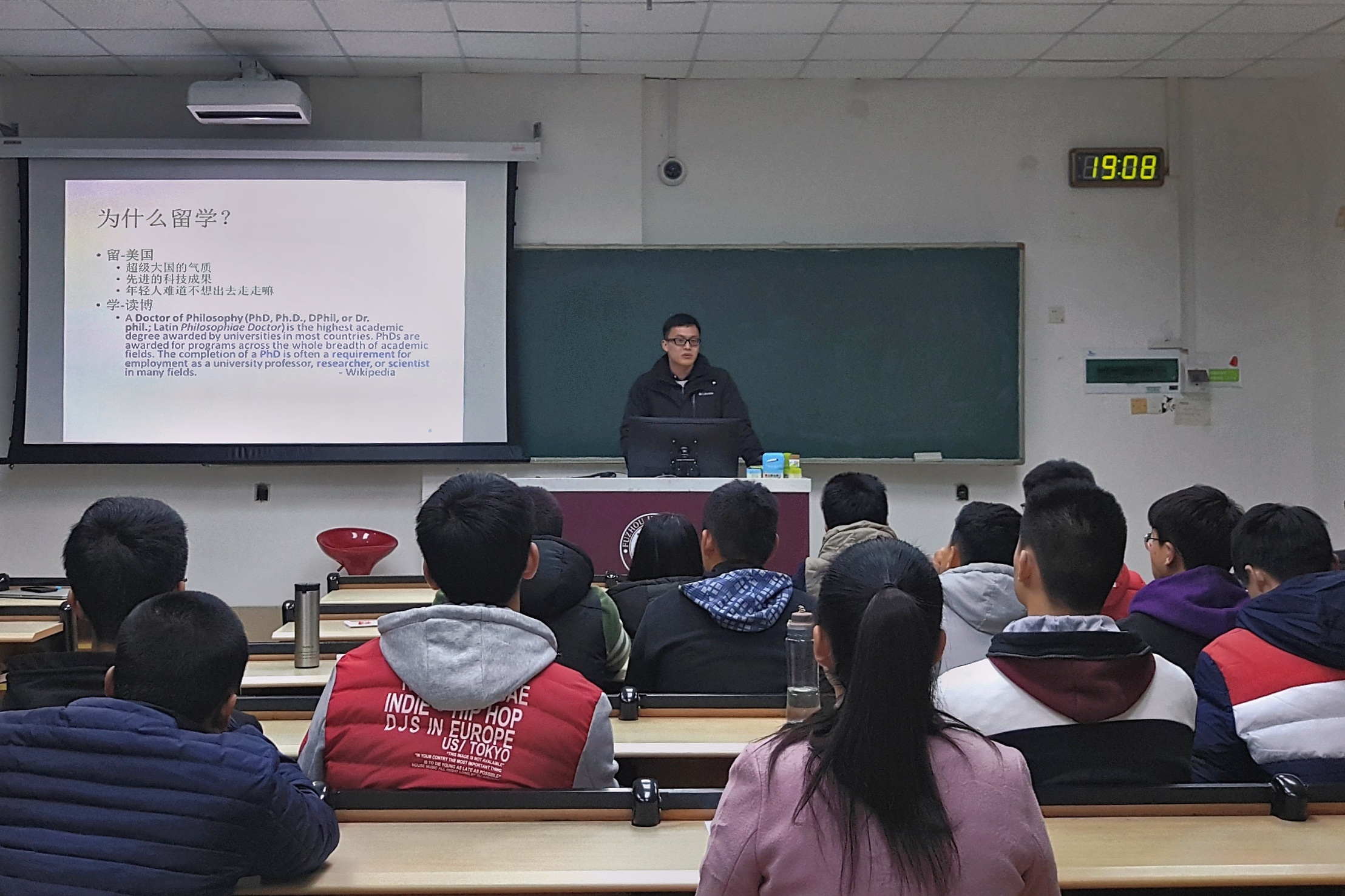 陈斌学长首先就留学生涯规划进行了详细讲解。从入境美国到留美生活,从留学意义到目前大学生准备留学的短期目标,陈斌学长用亲身实例分享最真实的留美体验。接着,陈斌学长针对大一及大二学生,以伯克利大学为例对大学时间管理、留学申请流程及费用和留学途径做了介绍。最后,陈斌学长对同学们提出的常见问题进行了一一解答。