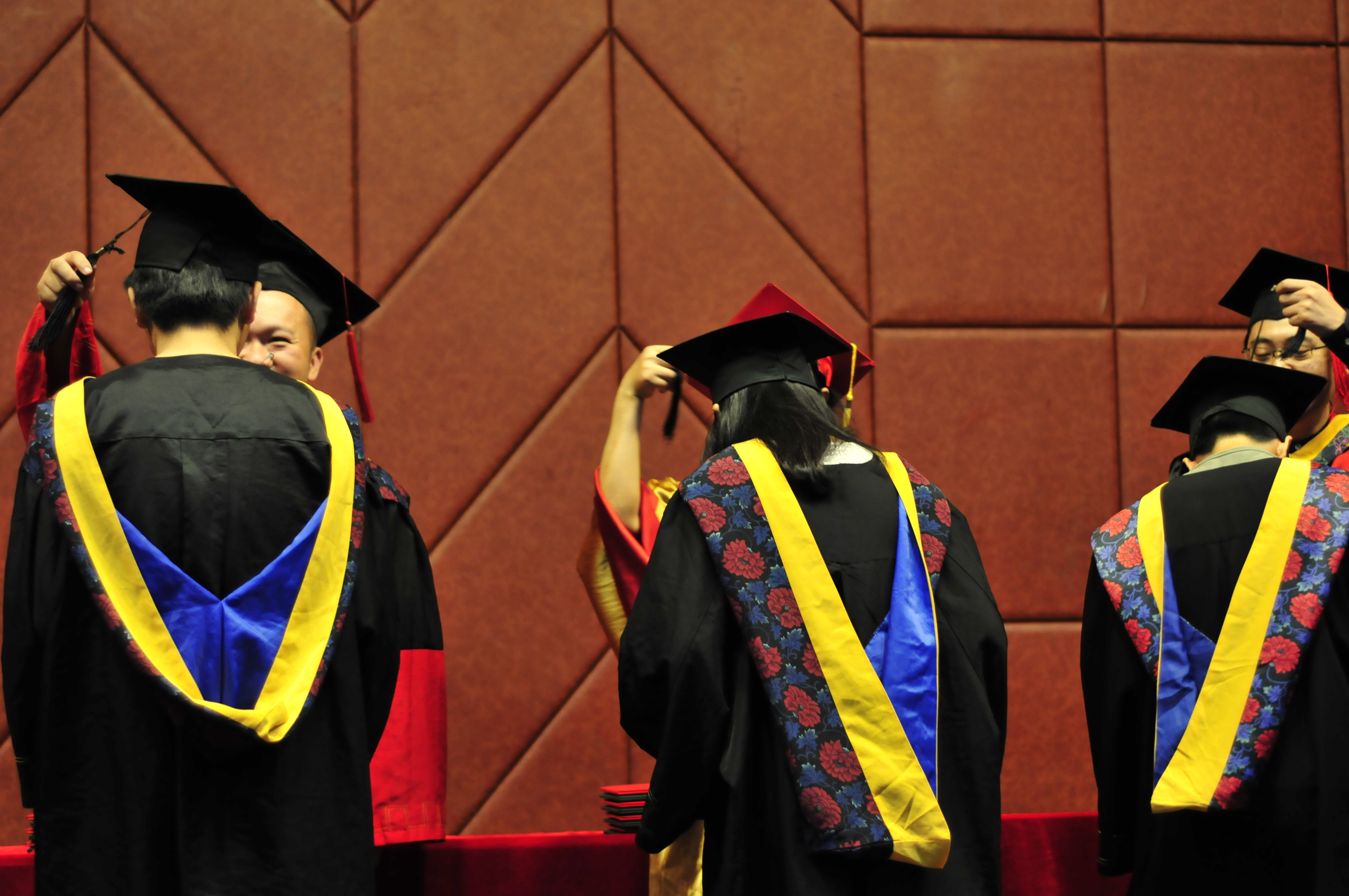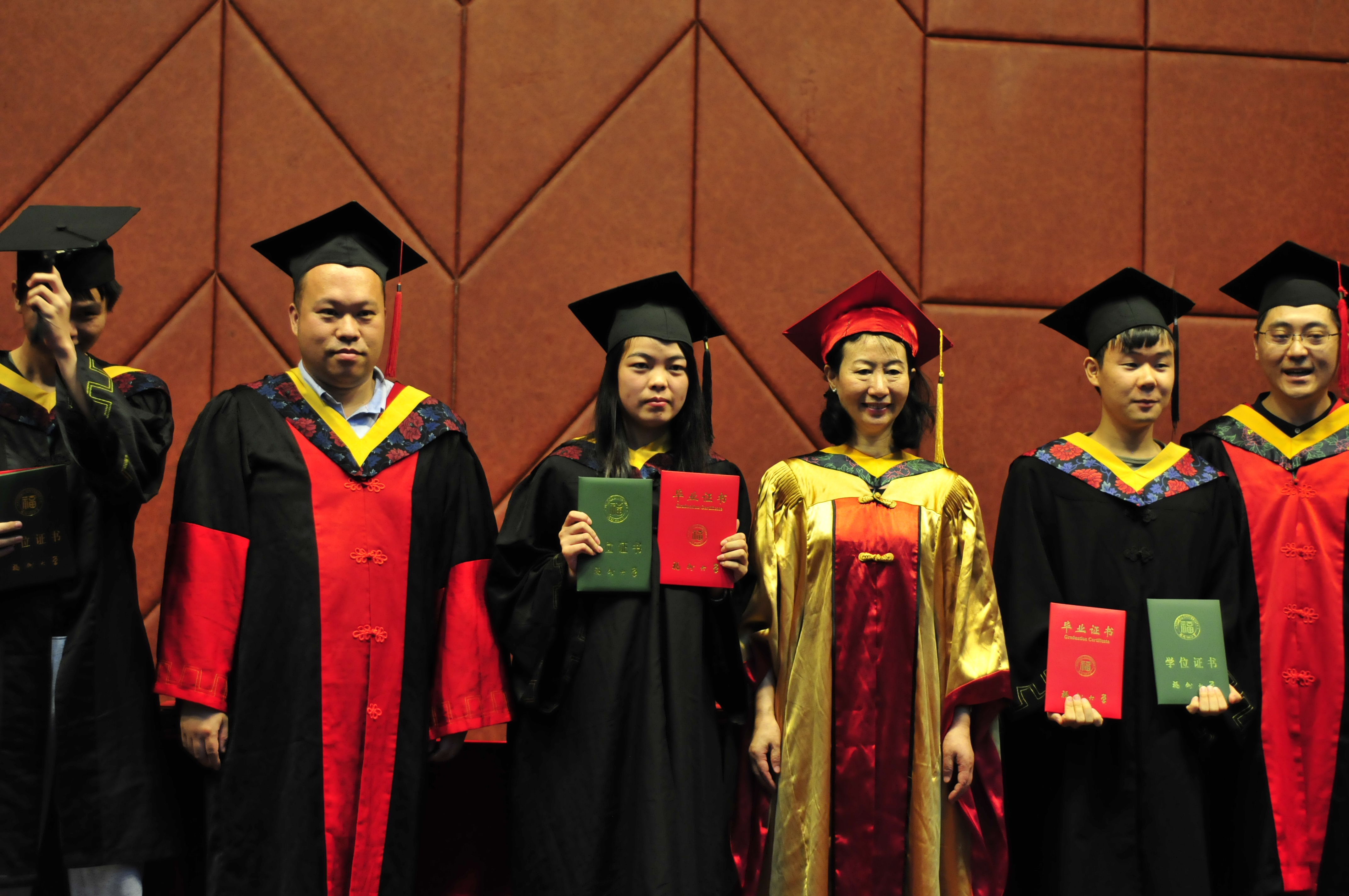 学位授予仪式开始,王晨教授宣读获得成人动漫 工学学士学位的同学名单。随后,詹红兵院长身穿金色学士服,头戴红色学士帽,与王晨副院长、张腾副院长两位老师一起共同为毕业生授予学位证书、毕业证。伴随着悠扬的毕业歌,所有毕业生依次上台,并与三位老师握手拥抱,向老师们表达真诚的感谢之情,在拨穗仪式后手持证书与院长合影留念,表达内心的感恩与不舍。仪式结束后,毕业生们纷纷与老师、同学合影,在大学的最后一段日子留下自己的独家记忆。