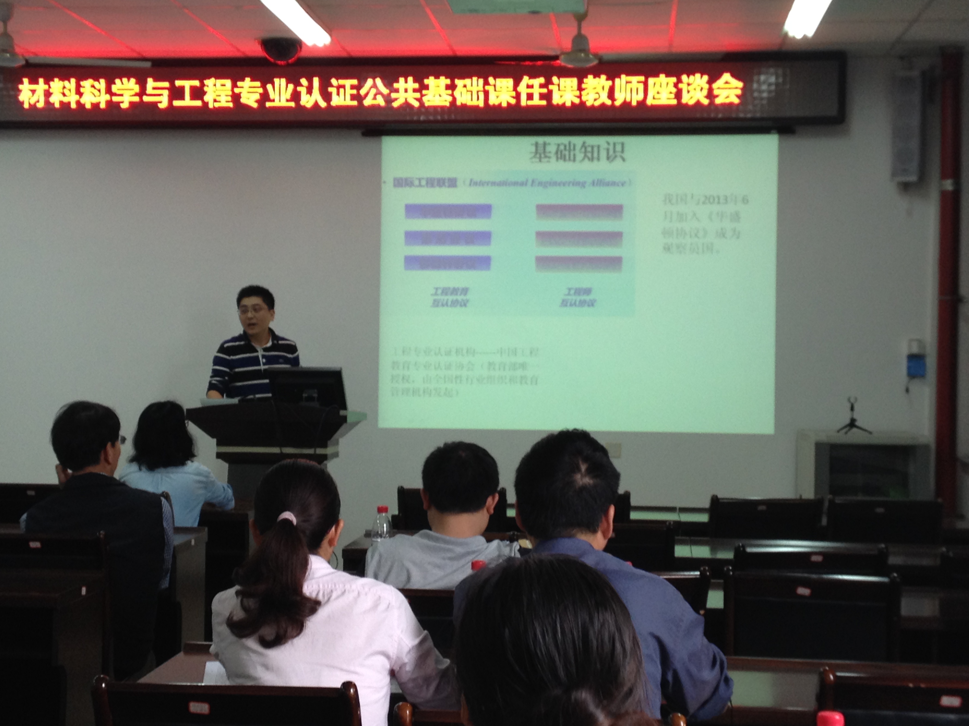 2016年5月19日,成人动漫 组织了材料科学与工程专业认证公共课任课教师座谈会。副院长于岩老师担任本次座谈的主持、材料科学与工程系系主任王晨老师担任主讲,成人动漫 党委书记徐雪玉、院长詹红兵及本院相关教师参与了此次座谈,20余位本校其他院教师也积极配合参与了座谈。
