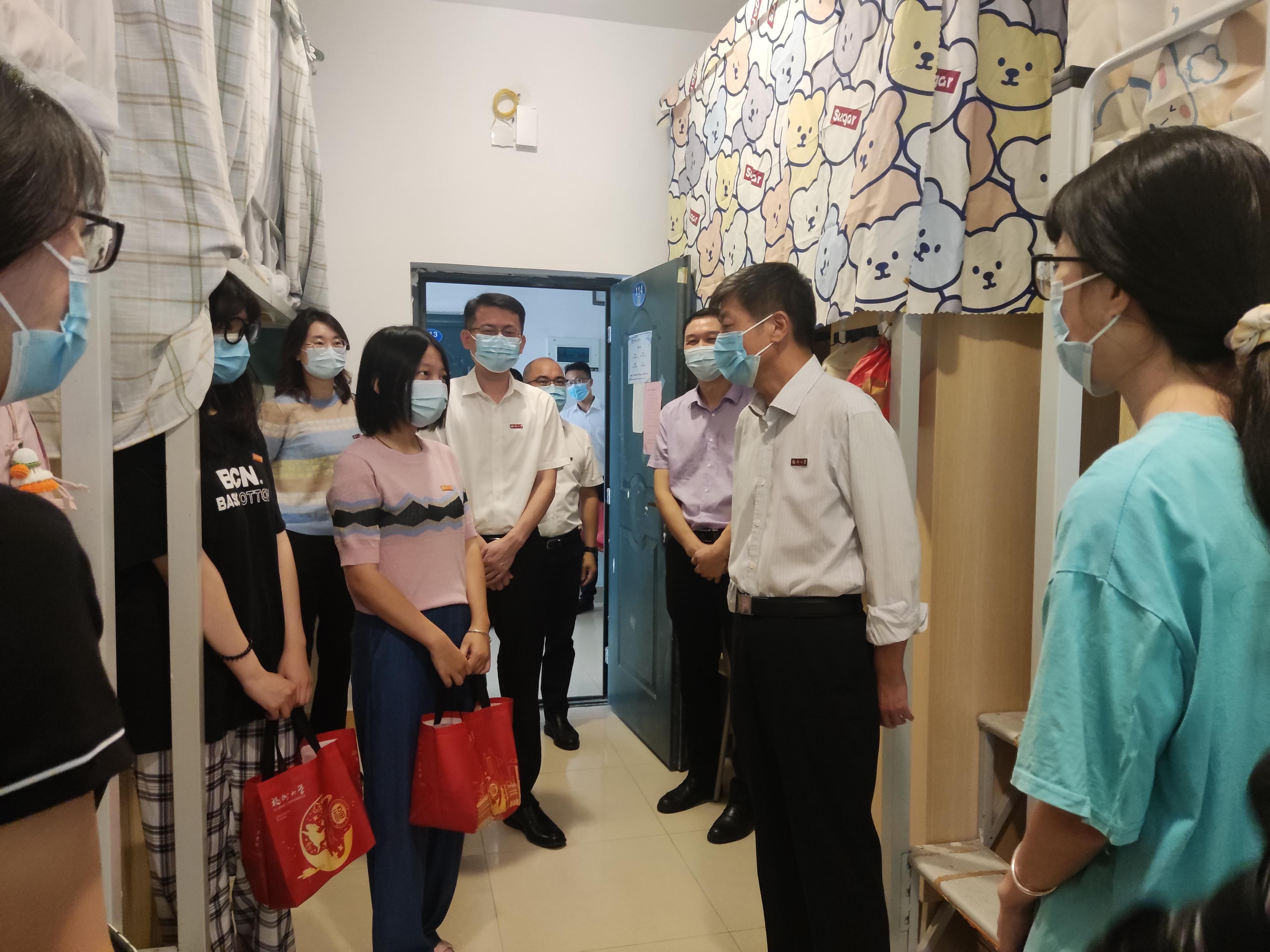今日,校长付贤智院士、校党委黄身勇副书记等领导在院党委张志忠副书记,王怡老师的陪同下来到成人动漫 研究生新生宿舍区关心慰问同学并赠送礼品,带来节日的祝福。