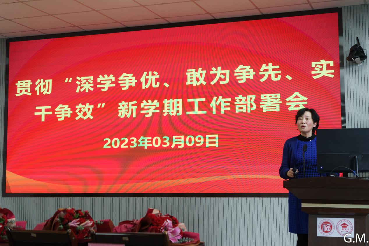 随后,学院开展了“深学争优、敢为争先、实干争效”新学期工作部署会。全体院领导就分管工作等方面进行深入阐述,并完成新学期的工作部署。院党委倪朝霞书记要求,全院教职工要深入学习贯彻党的二十大精神,认真落实校党委关于实施“深学争优、敢为争先、实干争效”行动部署,脚踏实地,埋头苦干,不折不扣完成各项重点工作和全年目标任务,加快推进学校“双一流”建设。