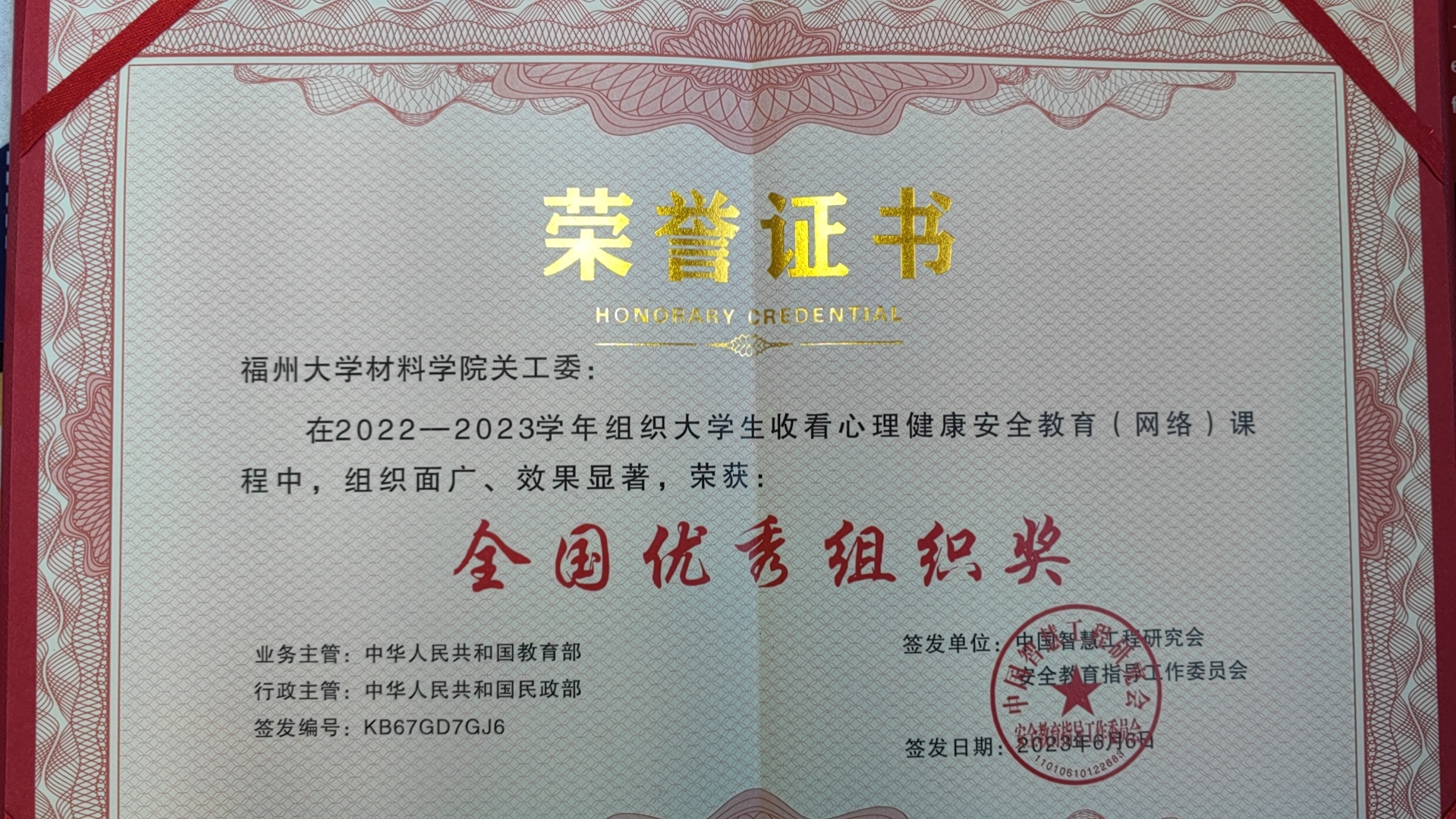 经中华人民共和国教育部和中华人民共和国民政部评审,成人动漫 关工委在2022-2023学年组织大学生收看心理健康安全教育(网络)课程中,组织面广、效果显著,荣获全国优秀组织奖,特此祝贺。