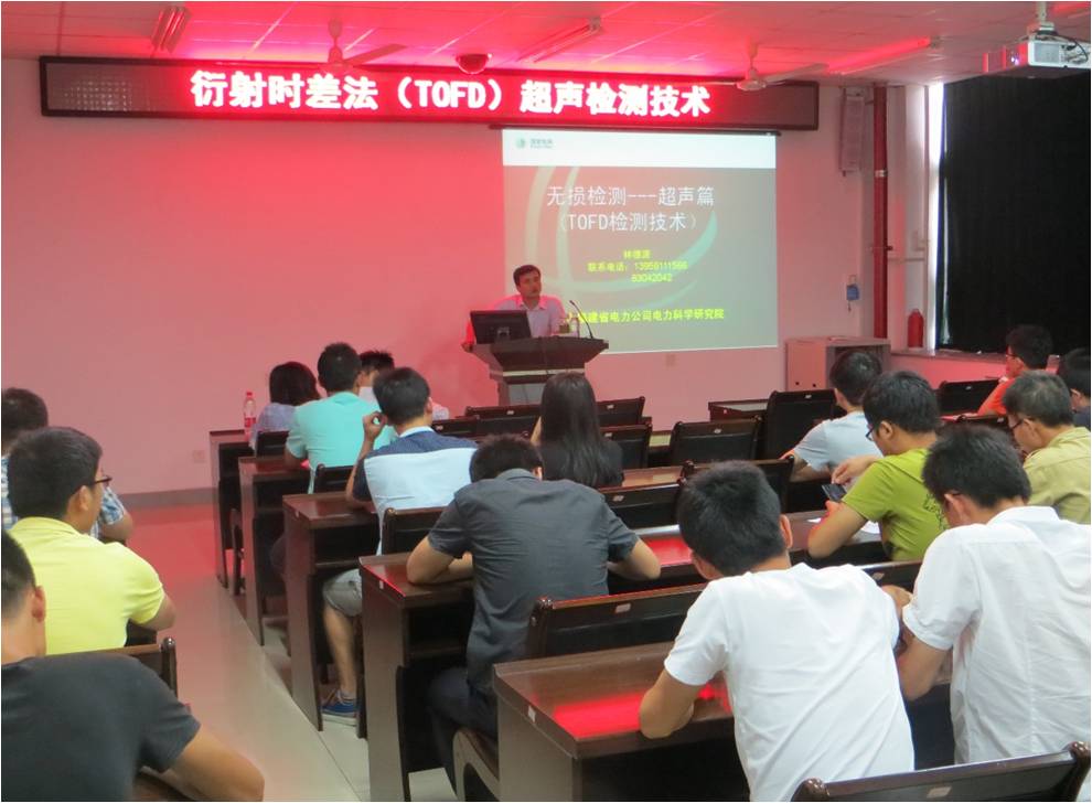 2015年6月11日下午,国网福建电科院材料所副所长林德源高工,受邀在材料楼404会议室为同学们开展了一场关于“衍射时差法(TOFD)超声检测技术”行业报告会,向同学们介绍了超声检测技术的应用特点和发展前景。报告会由学院专业硕士学位点负责人林枞老师主持。