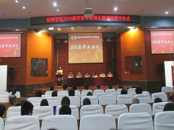 6月17日上午,成人动漫 2015届学生毕业典礼暨学位授予仪式于嘉锡楼一楼报告厅隆重举行。出席此次典礼的领导嘉宾有:成人动漫 党委书记徐雪玉、院长詹红兵、党委副书记王剑龙、副院长林起浪、材料科学与工程系主任王晨、高分子材料与工程系主任吕秋丰及部分教师、辅导员。此次典礼由王剑龙主持。2015届全体毕业生及部分学生家长参加本次典礼。