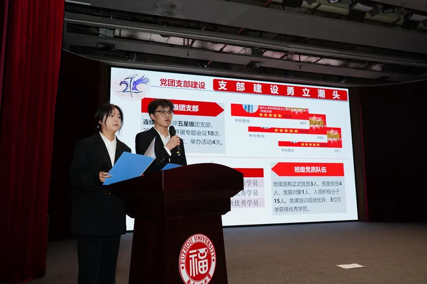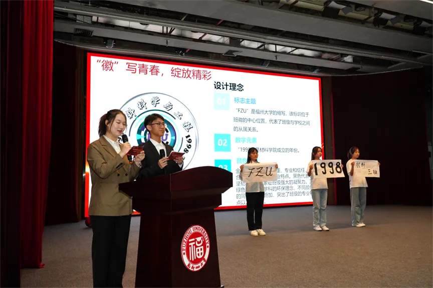 他们对班徽进行介绍,对班级荣誉、团支部活动、班级建设、学雷锋活动等进行总结汇报,以青春之我展示材子风采。