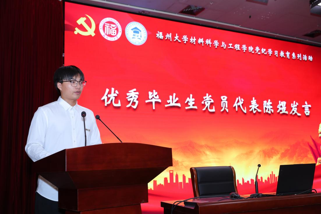 大会伊始,全体党员齐唱国际歌,歌声庄严而肃穆,响彻礼堂。曲毕,全体毕业生党员共同观看党纪学习教育警示视频,以清正劝勉,以廉政警醒,指引着同志们未来的道路,同志们深有感悟。而后党委罗涛书记为同志们进行党员党风党纪教育。在优秀毕业生党员代表陈煜发言后,党委罗涛书记为毕业班党支部代表颁发了党徽。