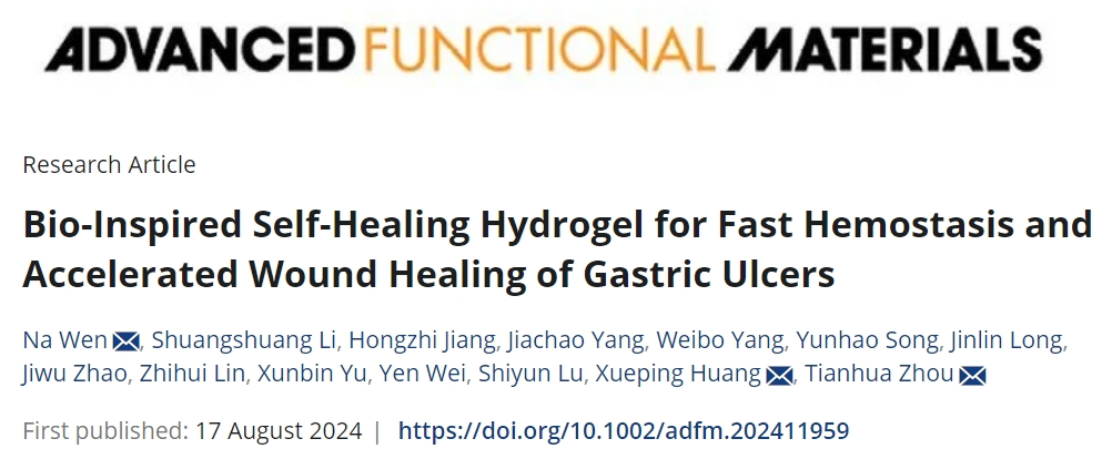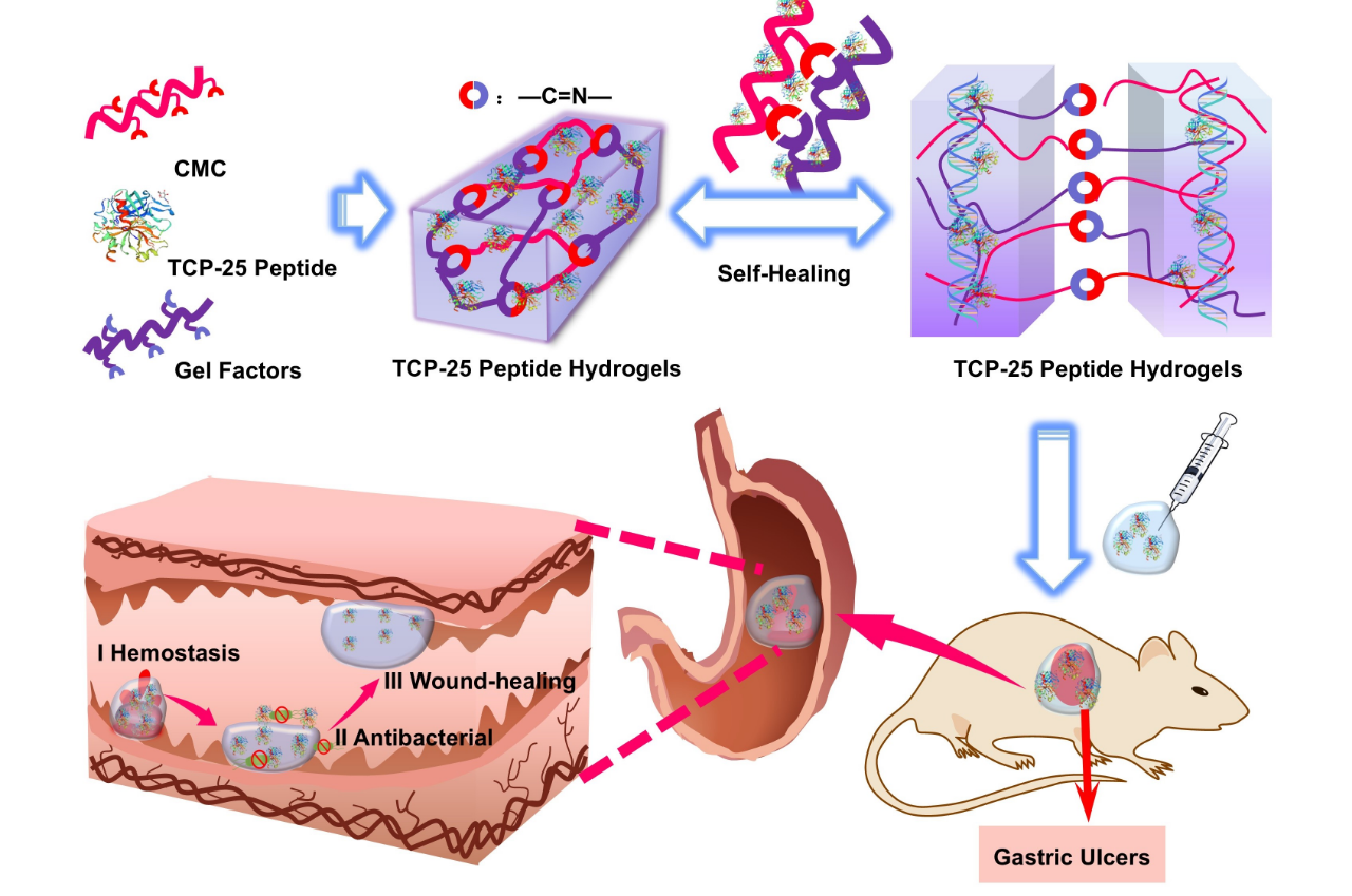 胃溃疡是一种全球性常见的消化系统疾病,临床上伴随急性或慢性出血的胃溃疡严重威胁患者生命,调查显示,成年人每年胃溃疡的发病率为10%-20%。伴有急性或慢性出血的胃溃疡有很大的致命风险。然而,如何在胃溃疡出血时实现快速止血和伤口愈合,是一项艰巨的挑战。目前的临床治疗方法包括质子泵抑制剂和胃黏膜保护剂等,但其效果均不尽如人意,为了应对这一挑战,近日,成人动漫 温娜与附属省立医院黄雪平、联合中国科学院物构所周天华研究员等人,受人体内源性防御机制的启发,以凝血酶衍生的C末端肽(TCP-25)作为靶向因子,并通过Schiff碱反应将其结合到两种新型可注射且生物相容的羧甲基壳聚糖(CMCs)基水凝胶中,设计开发了两种新型仿生TCP-25肽水凝胶。该TCP-25肽水凝胶实现了对急性或慢性胃溃疡出血的快速止血和创面愈合,显示出良好的临床应用前景。相关工作以“Bio-Inspired Self-Healing Hydrogel for Fast Hemostasis and Accelerated Wound Healing of Gastric Ulcers”为题发表在《Advanced Functional Materials》上(Adv. Funct. Mater. 2024, 2411959)。