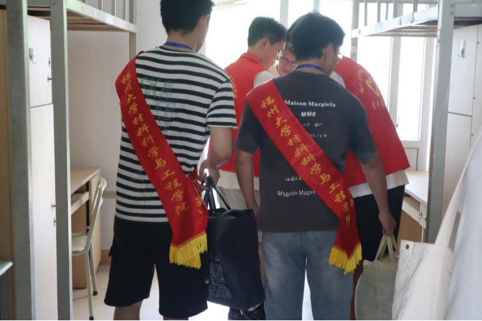 学院领导在新生宿舍仔细检查宿舍环境与设施状况,并与新生家长亲切交流,了解新生动态,对新生们的到来表示欢迎,希望同学们珍惜从五湖四海相聚此地的缘分,努力做真“材”实“料”的材料人!