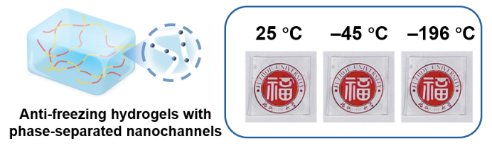 水凝胶因其可设计性和广泛的应用范围而受到高度关注。然而,由于内部大量水分子的存在,使它们在低温下容易结冰,从而破坏其原有的柔韧性和透明度,极大地限制了水凝胶在寒冷环境中的使用。在本工作中,通过调节水凝胶的微相分离结构,将水分子限制在纳米通道中并增加结合水的比例,可以提高水凝胶的抗冻性能。即使在液氮中保存1000 h后,水凝胶仍具有良好的透明度。同时,该水凝胶还表现出优异的低温形状记忆和智能光波导性能。此外,水凝胶可以组装成应变和压力传感器,从而在低温下进行柔性传感。