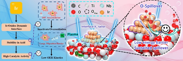 本研究利用等离子体技术(Plasma)调控了金属/氧化物载体界面的氧溢流,以显著减轻了OH*的迁移障碍。实验及理论计算结果进一步揭示了界面氧空位的对氧溢流及电子结构的影响,阐述了催化剂性能提升的内在原因。这项工作为氧溢流的作用和设计用于PEMWEs的Ir基催化剂提供了独特的见解和新思路。