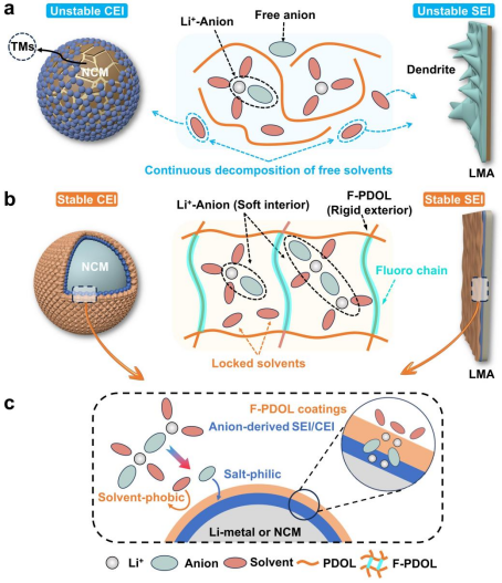 近日,成人动漫 郑云教授、张久俊院士团队报道了一种基于“外硬内软”设计的新型高压聚醚电解质:以三维含氟网络构筑刚性外壳框架,框架内部则通过强化锂离子-阴离子配位形成独特的柔性溶剂化结构。该电解质在25 ℃下实现了 1.13 mS/cm 的离子电导率,0.85 的锂离子迁移数以及扩展至 5 V 以上的电化学稳定窗口。此外,这种设计还诱导形成“亲盐疏溶剂”界面层,可稳定电解质/电极界面,极大地减少了副反应。所开发的电解质表现出卓越的性能,能够完美兼容各种先进的高压正极,如NCM523,NCM622,NCM811和LCO等。特别的,使用NCM811和锂金属配对的电池在4.5V、1C倍率下能够实现400次循环后保持96.3%的容量,即使在4.6V的高压下,也能实现100次循环后85%的容量保持,为高性能准固态电解质的设计提供全新思路。