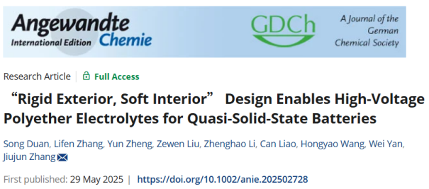 文章信息:S. Duan, L. Zhang, Y. Zheng, Z. Liu, Z. Li, C. Liao, H. Wang, W. Yan, J. Zhang, “Rigid Exterior, Soft Interior” Design Enables High-Voltage Polyether Electrolytes for Quasi-Solid-State Batteries, Angew. Chem. Int. Ed. 2025, e202502728.