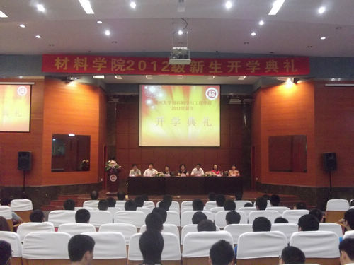 2012级新生开学典礼于嘉锡厅一楼报告厅隆重举行。院党委书记徐雪玉、院长李强、副院长李湘祁、副院长郑玉婴、教师代表朱定一、高分子材料工程系主任吕秋丰、无机非金属材料系主任林枞、院办公室主任陈宝榕、院团委书记卢杰、院教学干事黄艳以及各年级辅导员和来自五湖四海的150名新生共同参与了这一盛事。典礼由院党委副书记陈伟民主持。