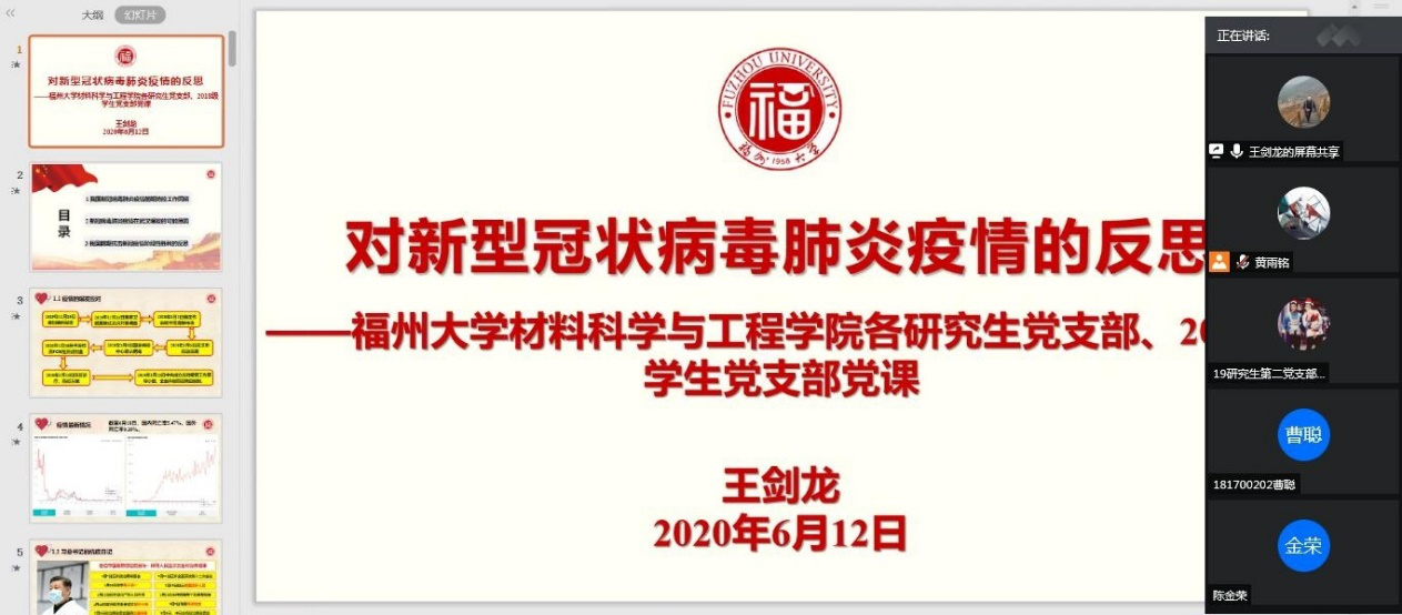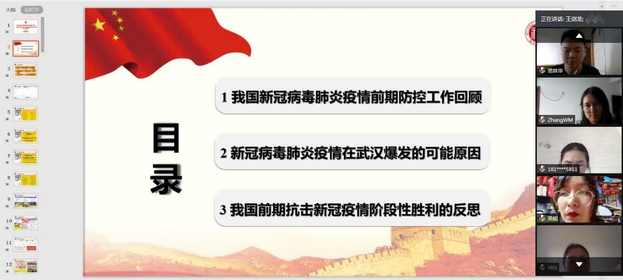本次“对新型冠状病毒肺炎疫情反思”的“云”党课结合当前防控形势,充分利用“互联网+党建”的新思路助力学生党员线上学习,引导学生党支部筑牢“红色堡垒”,充分发挥学生党员的先锋模范作用。