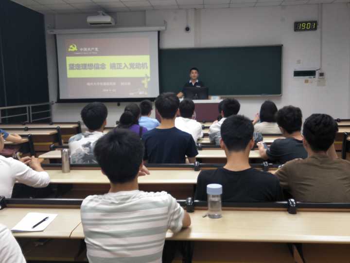 课程开始后,柯江锋老师先向大家简单介绍了中国共产党的建立过程,并鼓励大家要在课余时间多阅读书籍了解党史,拓宽自己的知识面。紧接着,柯老师就入党动机这个出发点指出,每一位申请入党的同志,都应该剖析一下自己的思想,思考一下自己究竟是抱着什么样的动机申请入党,对于不正确的入党动机也应该积极用行动去改正。随后,柯老师现场讲解了入党流程,让在场积极分子更了解怎样入党。最后,柯老师以自身经历为实例强调了三点:一、同学们要树立远大理想,做高尚的人;二、要讲好自己的大学故事,历练自己;三、要不忘初心,每天进步,做一个执着的人。