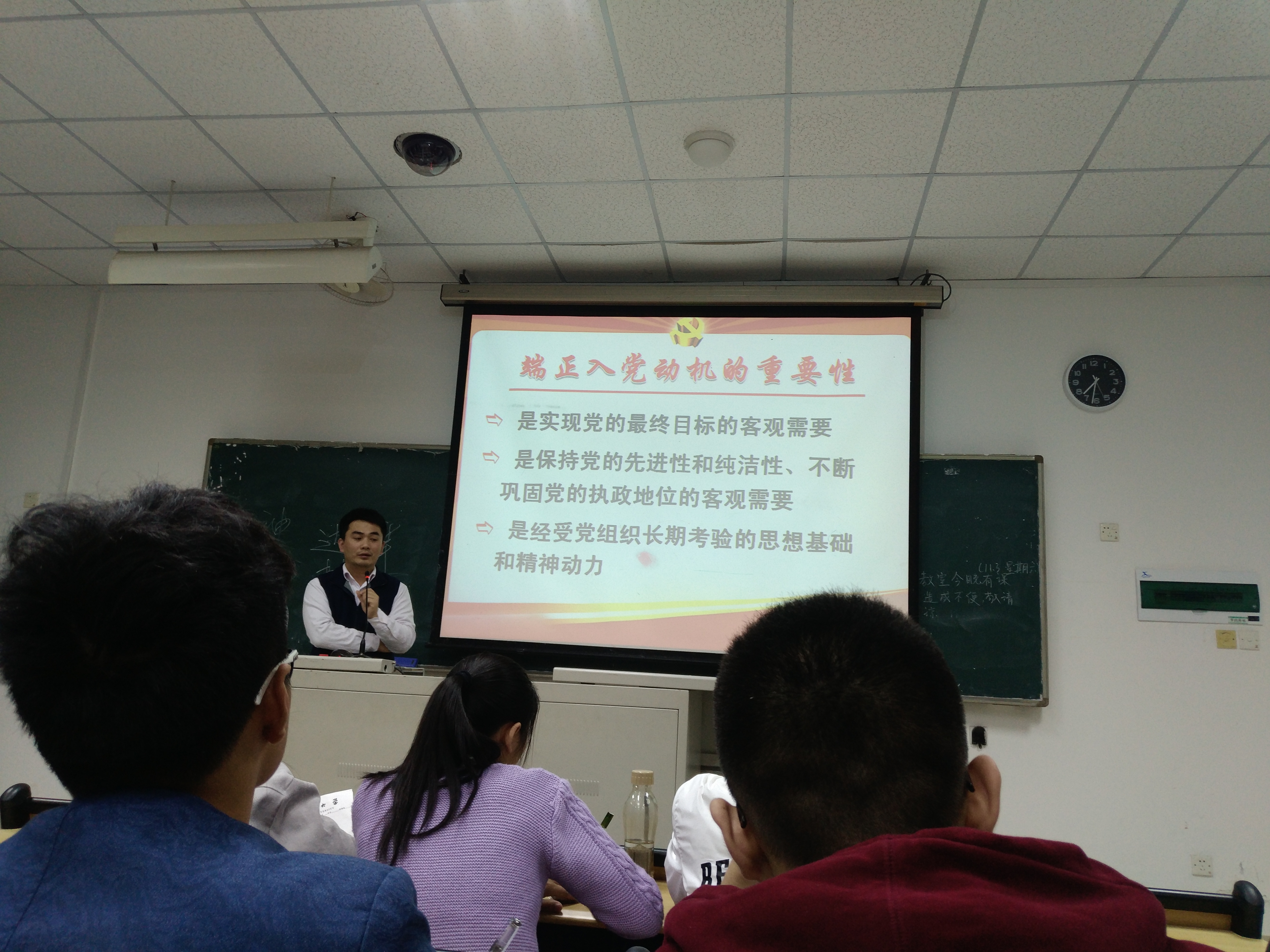 在王导简单介绍授课老师后,党课正式开讲。柯老师先列出了党课的纲要,分别为:大学生入党动机类型分析、正确的入党动机及其内涵以及大学生如何端正入党动机。柯老师围绕三个方面授课。他为同学们娓娓道来党的发展史,介绍了中国共产党在建设社会主义中路上的艰辛与不易。并与同学们一同观看了“我是谁”的视频,柯老师以8000万的中国共产党员一同为了每个中国人民的梦想而奋斗作为观看结语,唤起同学们为中国共产党建设贡献力量的热情。随后,柯老师对入党动机做了具体分析,指出端正入党动机的重要性,强调“全心全意为人民服务,不惜牺牲个人的一切,为实现共产主义奋斗终身”是正确的入党动机。为了让同学们早日端正入党动机,柯老师介绍了端正入党动机的途径。最后,老师提出了几点共勉,“希望同学们能够具备高尚的品质,少抱怨、做一个积极向上的人”。