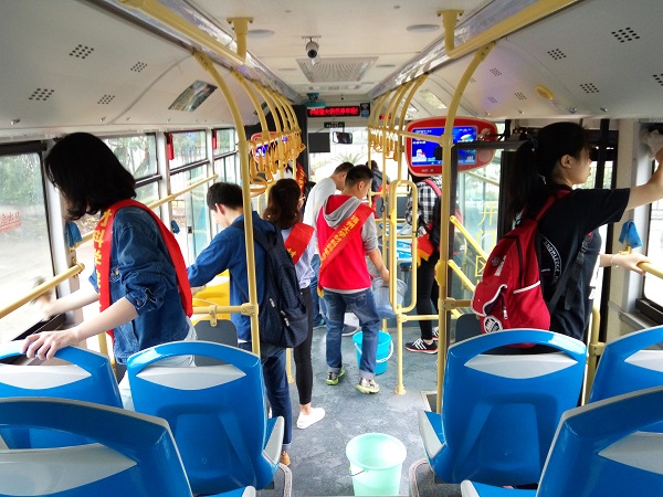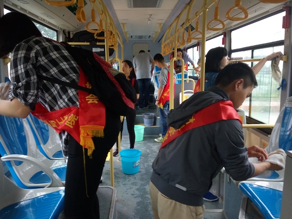 清晨,志愿者们带着打扫工具在8号楼集合,并一起到达福大生活四区96路公交总站,准备清扫福州96路公交车。红会副部简单介绍打扫任务,他要求一组同学负责一辆公交车,并需在8分钟内打扫完一辆之后,志愿者们开始行动。每来一辆车,志愿者们就带着工具上车,开始打扫。期间,有的志愿者用抹布蘸洗衣粉水,擦公交车内的车座、车窗边沿、车扶手和各个死角,有的志愿者用清水擦洗衣粉水擦过的地方。为了方便,两个人为一组,一个先用洗衣粉水擦,另一个用清水擦。有的同学负责打扫车内地板和倒垃圾。在志愿者们的辛勤劳动之后,一扇扇玻璃洁净如新,一辆辆洁净的公交车重新上路。