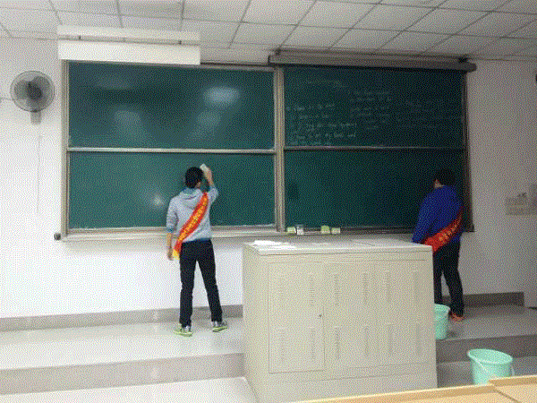 义务劳动是一个共青团员应当履行的义务。教室是广大学子们每天学习交流的地方,黑板是老师们传授知识的平台之一,日积月累之后,黑板上的痕迹斑斑,留下一层白蒙蒙的灰,这些粉笔使用的痕迹不能得到定时的清理,粉笔槽的灰也有厚厚的一层,这些粉笔灰会危害到教师以及学生的健康。为了不影响同学们自习,14级1班、2班团支部的同学们于晚上八点先到没人的教室里清洗,后前往其他教室清洗使用已久的黑板。经过一个多小时的努力,支部成员们清洗了大部分教室的黑板,许多还未下晚自习的同学纷纷表示赞扬。