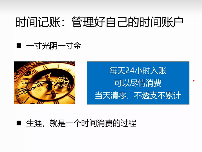 当明确一个目标后,会激励我们更加有效的利用时间,让梦想细化:大学之前的憧憬。大学毕业,想成为一个怎么的人?这此讲座主要讲授以下几个方面。一、时间记账:管理好自己的账户。一寸光阴一寸金,每天24小时入账,可以尽情消费,当天清零,不透支不累计。二、要事第一:事情分类。把时间消费在对自己重要的事上。利用直角坐标,依据是否紧急、重要,将事情分类为四个维度。三、专注:对时间敏感。在一段时间内,专注做一件事,同时处理多项任务,消耗更多的时间和更多的失误率。利用碎片时间,为碎片时间找到合适的用途。如果不能明确某段时间的用途,这段时间注定会被荒废。四、一事多用:为一件事设定多重目标。这与专注并非矛盾。例如看一篇英文电影,技能休闲娱乐,又可以学英语。