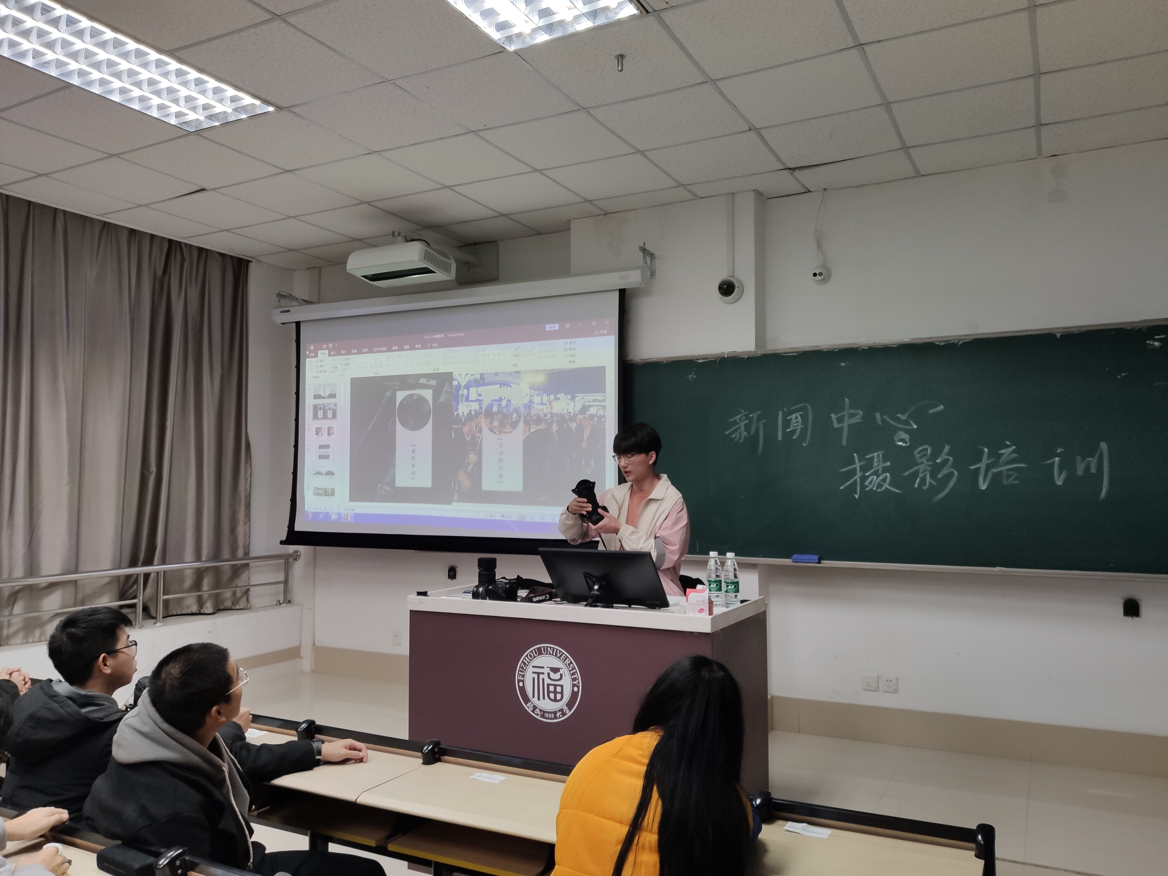 培训伊始,陈道祥同学以精致的摄影照片向同学们介绍了摄影照片的分类,并指出此次培训的主题——摄影理论基础与活动照基本摄影方法。接着,他向同学们科普了相机的分类与部分品牌特色。“摄影就是应该实际操作。”陈道祥同学如是说。他鼓励同学们在摄影的时候用手动挡进行拍摄,多拍摄多试错,才能有长足的进步。紧接着,他着重介绍了使用手动挡最重要的三个参数——快门、光圈和iSO,并举例讲解了其使用技巧。中场休息环节,同学们积极主动试用相机进行拍摄,展现出了对摄影的极大兴趣。