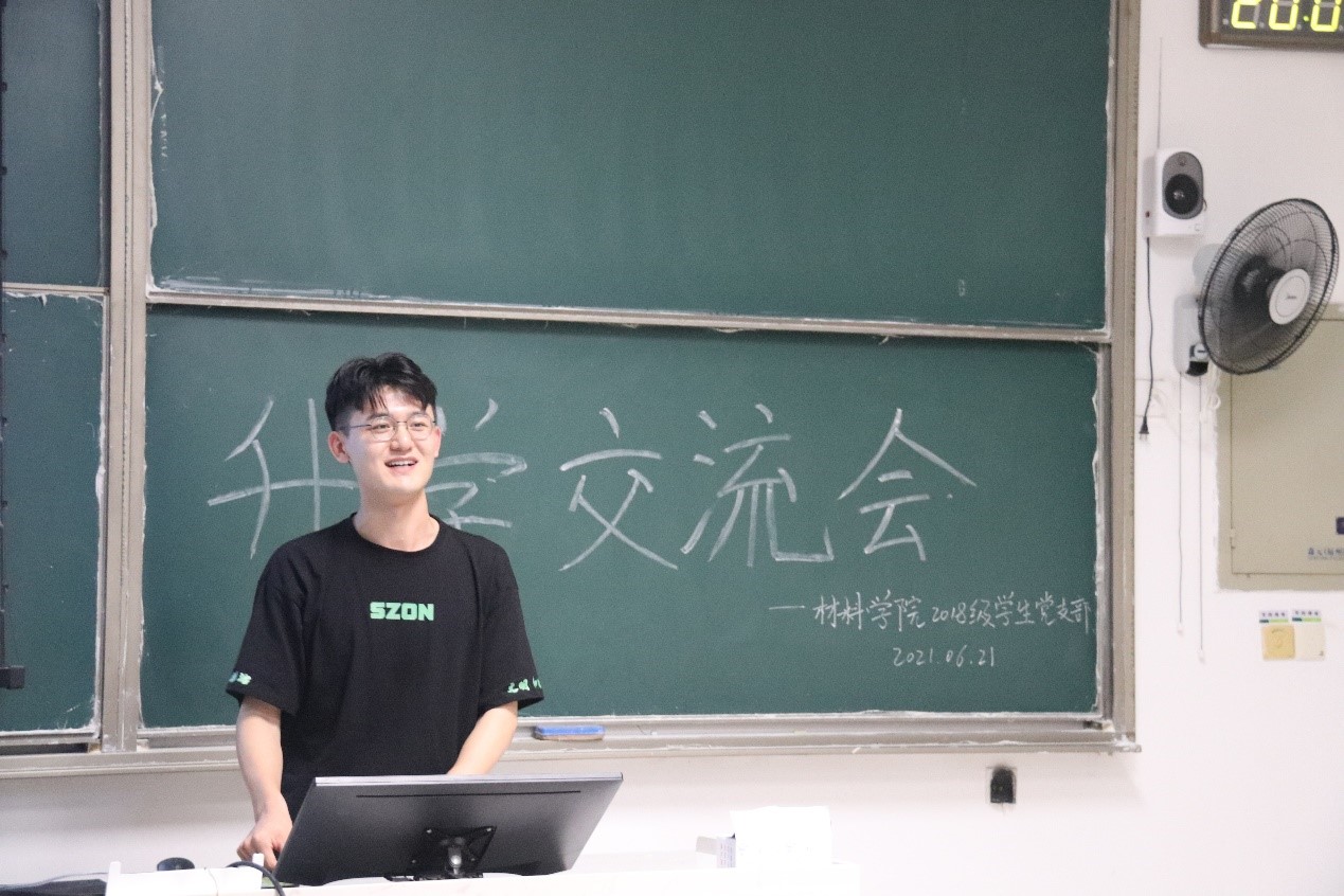 丁玉琪同学是跨专业考研大军中的一员,她从跨考难度、跨考心态和跨考计划等角度向同学们进行分享。王金朋同学所在的2017级2班班级保研人数在年级最多,班级同学升学至浙江大学、上海交通大学、中南大学、北京科技大学、厦门大学等名校,作为班长的他认为班级同学取得优异的升学成绩是良好的院系建设与学院老师、优秀学长学姐支持共同的成果,优良学风是优秀班级的基础,优秀的集体会带动每一个班级成员成长成才。