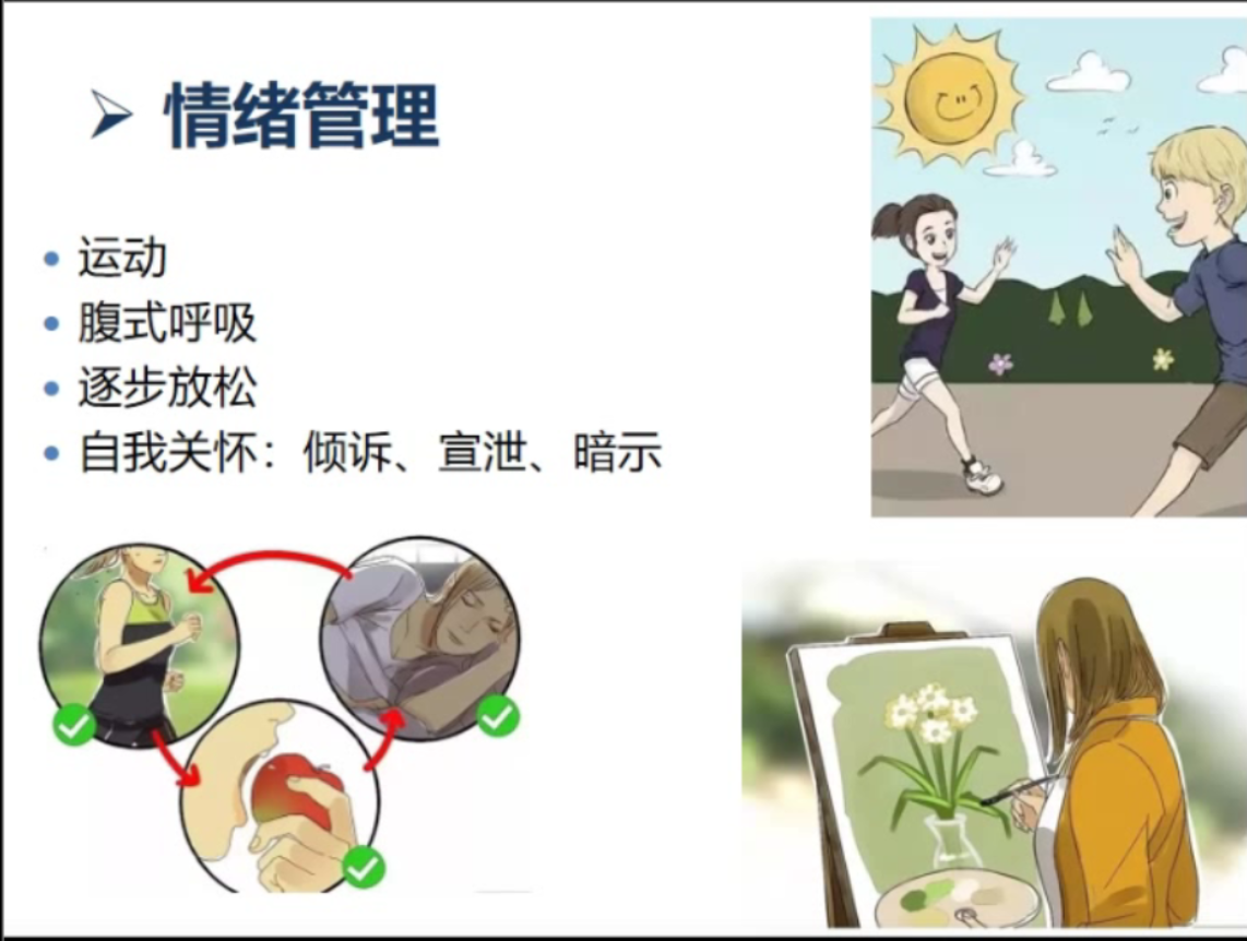 最后,黄老师从四个方面与我们探讨如何应对压力。个人特征中,我们要在主动适应中形成认同来促进有效适应,这包括了职业认同,生涯适应,主动行动等等;认知方式中,我们要有认知管理,要合理认知,理性辨别信息,正式接纳我们负面情绪;社会支持中,我们不要过于封闭自己,社会支持不仅能够给我们提供帮助,更能够给我们提供认知支持、情感支持、行为支持;情绪管理中,我们可以进行运动,腹式呼吸,逐步放松,自我关怀等等来调节我们的情绪。面对疫情,我们需要冷静理性、积极应对。