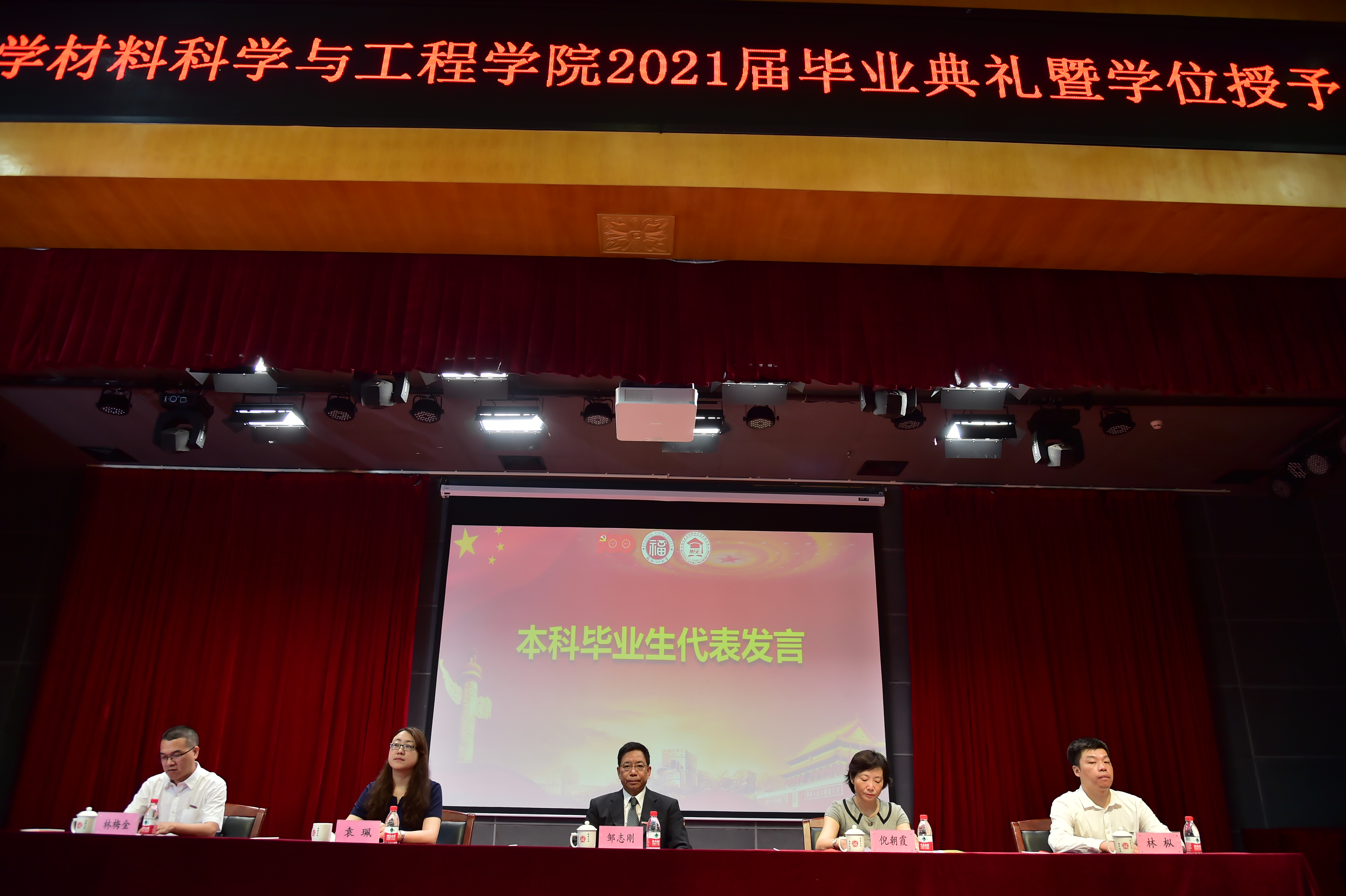 首先,本科毕业生代表苏茜薇同学发言。她表示身为福大材料学子,应始终践行“明德至诚,博学远志”的伟大精神,葆有“陶冶品质,淬砺刚强”的高贵品质。其次,研究生毕业生代表张夏兰同学发言。她表示愿在肩负时代重任时行胜于言,在“真刀真枪”的实干中成就一番事业。接着,教师代表蔡道平老师发言。他谆谆叮嘱毕业生们在之后的岁月中也要永葆朝气与良好的品德,终身学习,以青春力量献身祖国建设。