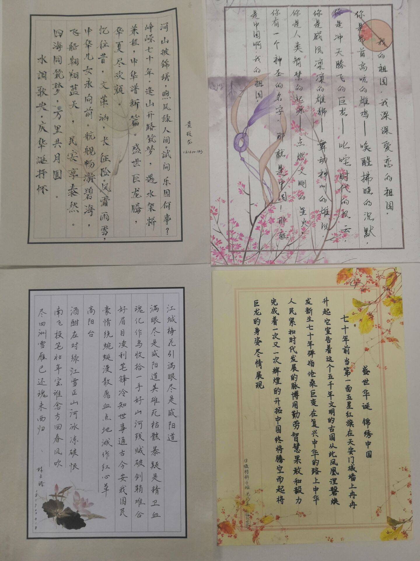 此次比赛中,同学们各显身手,踊跃参与投稿。书法组查校龙同学的作品夺得一等奖,一篇《水调歌头·庆华诞抒怀》描绘了这七十年来祖国历经风云变幻到如今“民安享泰然”的情景。在绘画组中,聂玮同学采用了剪纸方式,绘出了毛主席的画像,别具一格的创作方式使这幅作品登上了第一的宝座。