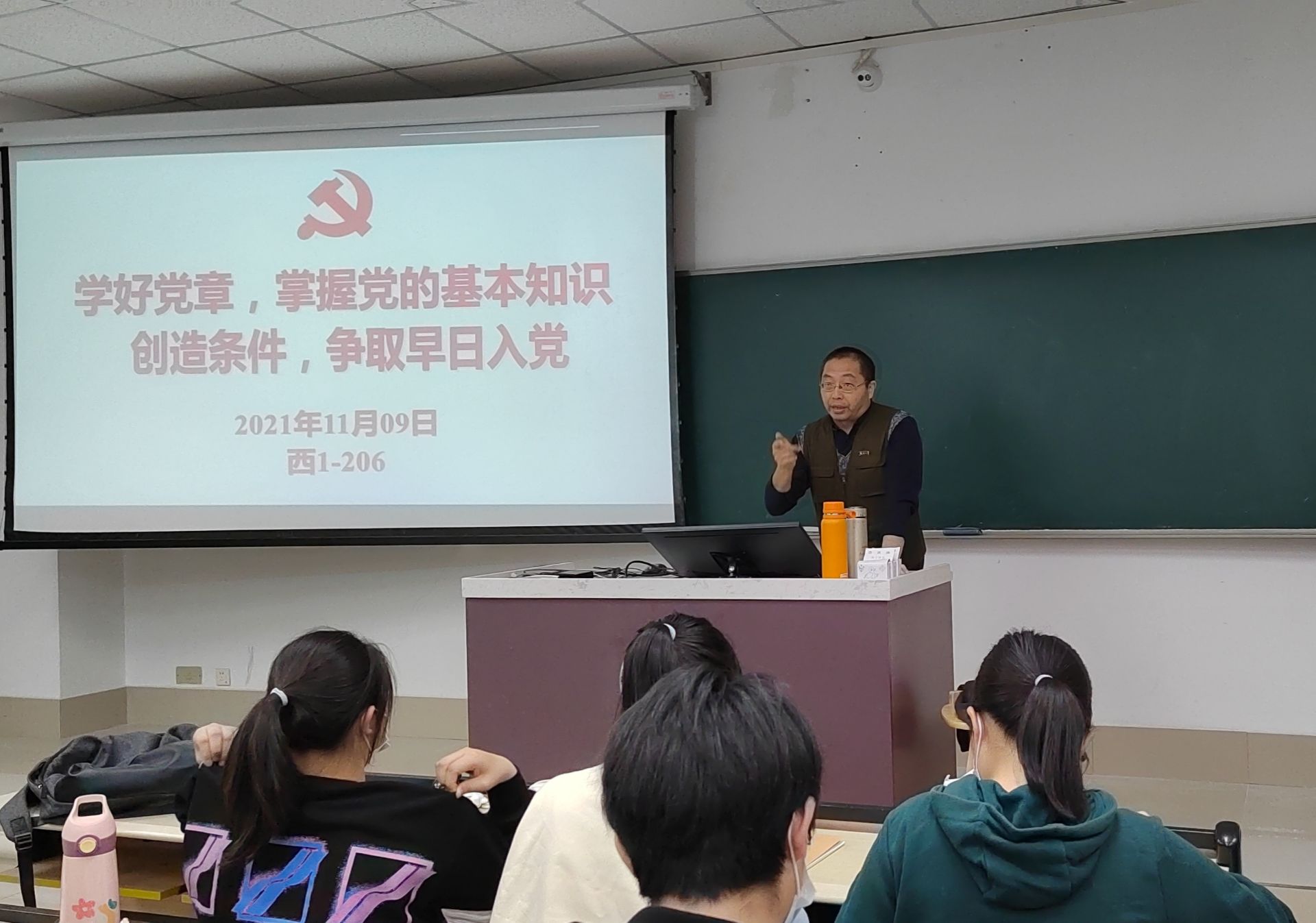 紧接着,王剑龙老师介绍了党章的结构与内涵。其中,他着重解读了习近平总书记的“七一”讲话,讲解了建党精神。此外,他还分析了应该如何按照党章要求成为一名合格党员。他告诫同学们要端正价值取向、加强纪律观念、保持良好作风、坚持走群众路线、做好工作和学习表率,做同学的领头羊、活动的组织者、群众的服务员和党支部的情报员。最后,王剑龙对同学们寄予了早日加入中国共产党的美好祝愿。