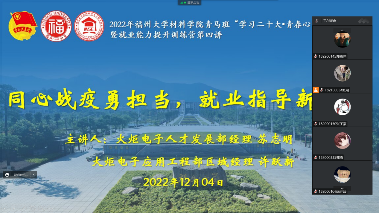为帮助同学们提升职业规划能力,了解材料专业相关的市场动态,12月4日,成人动漫 开展了以“同心战疫勇担当,就业指导新起航”为主题的青马班“学习二十大,青春心向党”第十讲暨就业能力提升训练营第四讲活动。