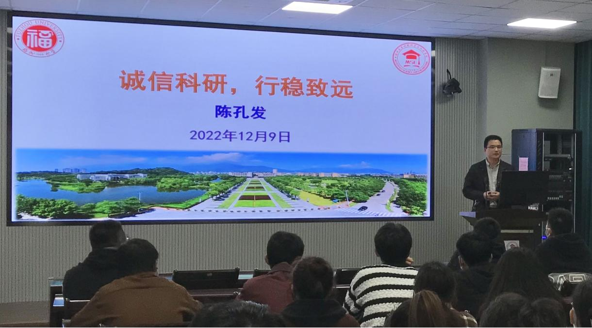 党的二十大报告提出:加快建设国家战略人才力量,努力培养造就更多大师、战略科学家、一流科技领军人才和创新团队、青年科技人才、卓越工程师、大国工匠、高技能人才。为全面贯彻党的教育方针,落实习近平总书记关于研究生教育指示批示精神,落实立德树人根本任务,强化研究生科学道德、科学精神和学术诚信培育,创建一流学风。成人动漫 与工程学院于2022年12月9日在材料楼404举办科学道德与学风建设主题教育系列活动之“诚信科研,行稳致远”讲座,特邀请成人动漫 材料结构研究所负责人、博士生导师陈孔发教授主讲。