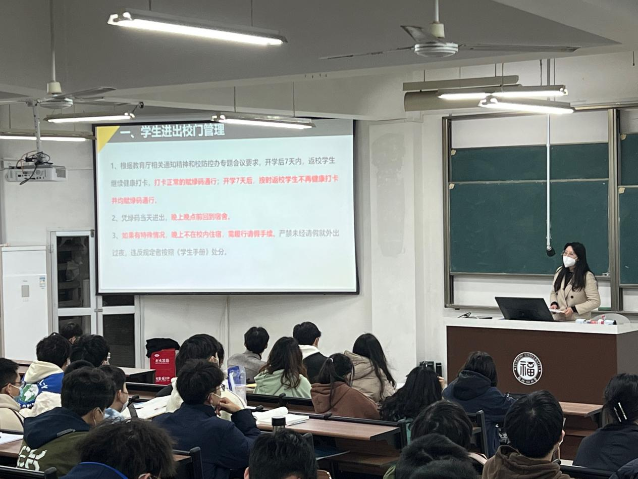 会议伊始,张丽芬老师详细讲解了新冠“乙类乙管”政策,建议同学们接种疫苗加强针,加强自我保护,做好自我健康第一责任人。随后,张丽芬老师就进出校园管理、日常健康管理、基础文明建设、宿舍管理和安全教育管理等方面做了说明,强调了杜绝夜不归宿、使用违规电器等行为。最后,张导希望同学们学会自我反思与评价,及时认清自己的不足之处,并在新学期里加以调整,珍惜大学时光,勤奋好学,朝着自己的目标努力前进。