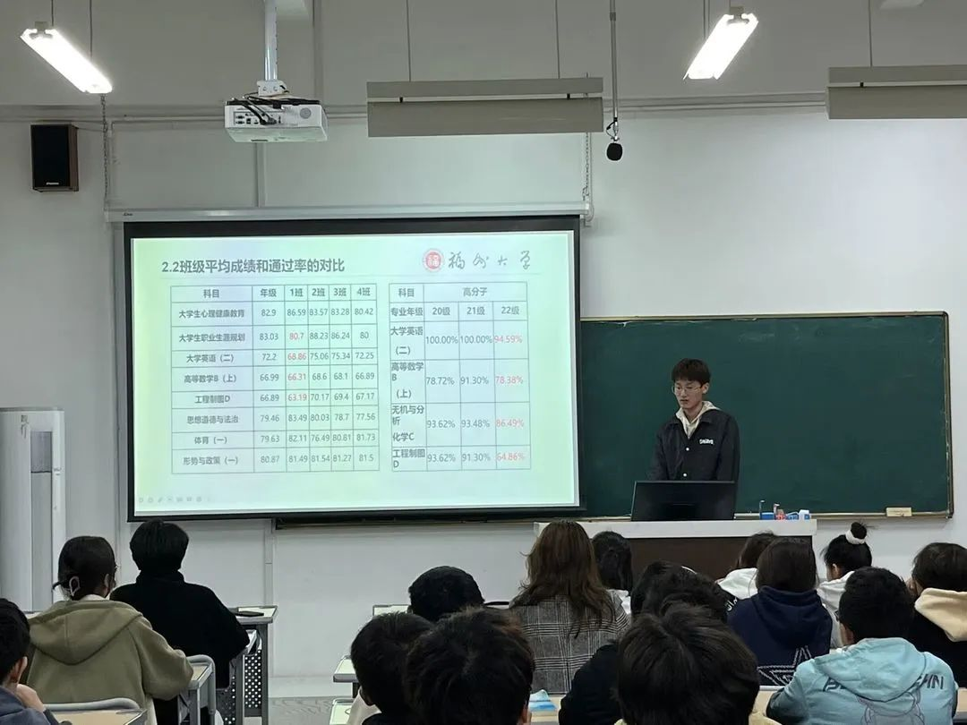 各班就班级平均分、各科通过率、成绩分布情况、各个科目存在的问题展开了详细的分析,提出对较难学科缺乏迎难而上的勇气、对简单科目不够重视等问题。接着,对班级单科状元和奖学金获得者进行了表扬和奖励。接着,学习优秀的同学、班导班助们上台分享了学习情况和心得体会,希望同学们在不断适应中保持良好的学习习惯,严于律己,提高综合素质,让自己的履历更加丰富多彩。