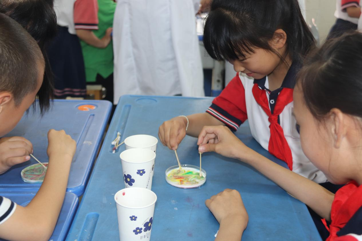 讲解过后,主讲老师和助教手把手地引导孩子们亲手体验实验操作,让同学们感受到化学实验的神奇和魅力。最终,小朋友们成功地用“隐形墨水”传递“秘密信息”,创造出色彩斑斓的“牛奶烟花”,成为了优秀的“变色魔法师”。