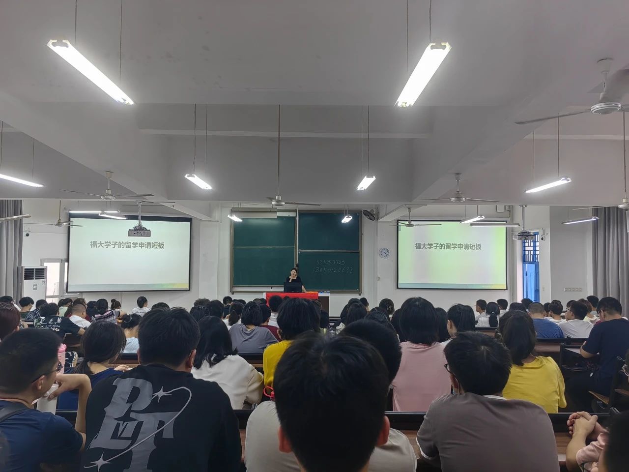 首先由新东方王老师给同学们详细讲述“考雅思”的意义及好处。王老师从自身经历出发,借自身考雅思获得工作的经历,引出考雅思所带来的一些机遇与选择。随后王老师通过列举一些具体事例,确切地展现给同学们世界级高校对雅思的要求,以及国内某些知名高校给予雅思高分考生的便捷通道。然后由另一新东方知名国外升学讲师给同学们讲述出国升学的原因、意义以及具体条件。老师罗列出五大出国留学人数上涨原因,从而引出出国留学对于大学生而言,不仅是一个提升自我的良好机会,更是一条实现未来理想的全新道路。老师还建议同学们若有出国意向的需提早准备各项出国事宜,并给予同学们“大三留学准备方案”以供参考。最后老师将“主流留学目的国家/地区硕士申请条件介绍”分为软硬实力指标两个部分,具体清晰地展现了留学要求,便于同学们参考。