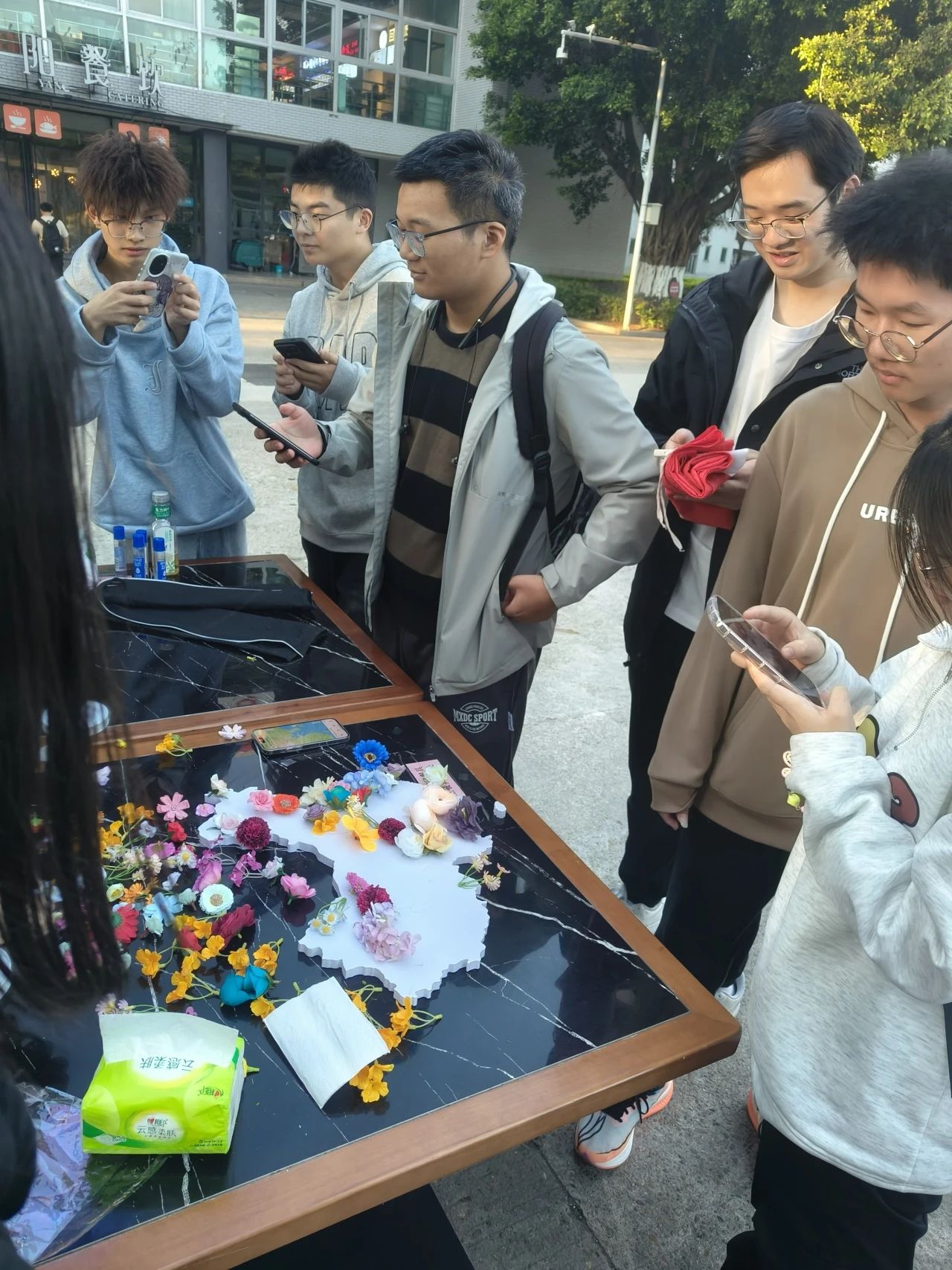 一朵朵塑料小花装点了陶制的地图,一抹抹自豪之情汇聚成最鲜艳的中国红,每朵花都彰显着当代青年对祖国的关心与热爱。