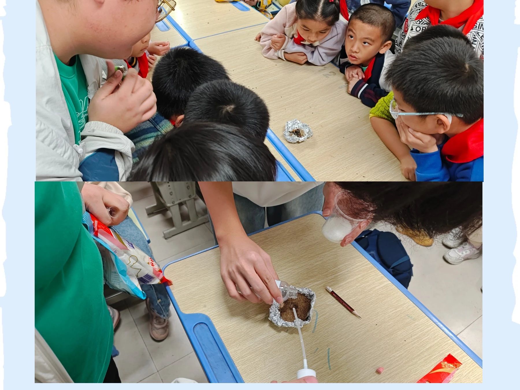 在“生气的瓶子”实验中,在气球中加入小苏打,再将气球套在装有水的瓶子上,小苏打与水接触放出气体,让气球瞬间变大,充分展示了化学反应的神奇。随后,在2024级材料科学与工程5班团支部成员的协助下,小朋友们分组进行了实验,他们对气球的膨胀现象充满好奇,争先恐后地去触摸,现场洋溢着浓厚的科学探索氛围。