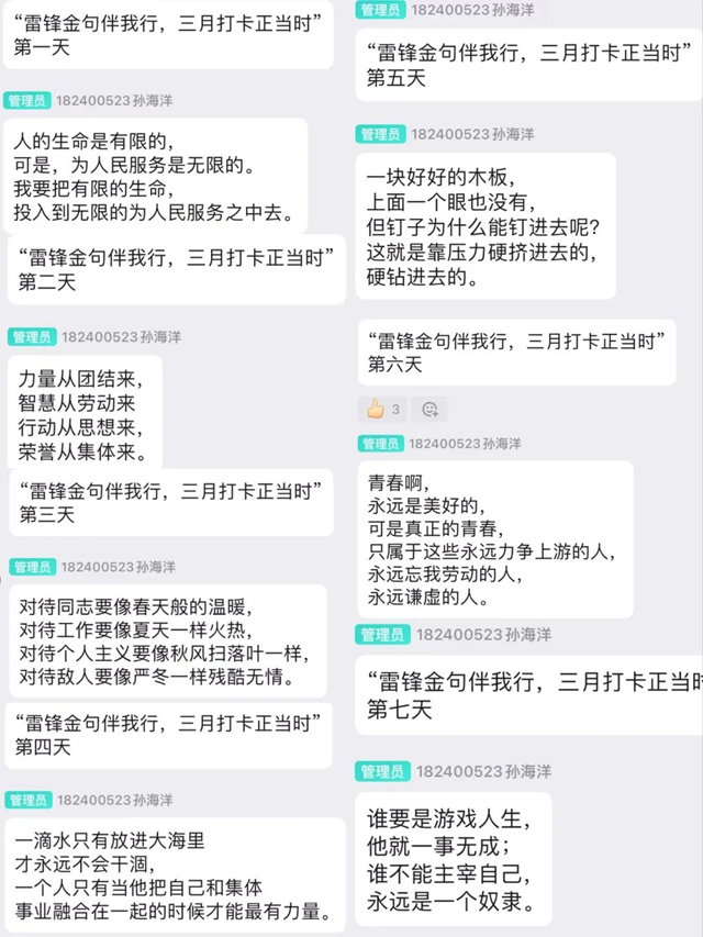 为深入践行社会主义核心价值观,传承雷锋精神,由成人动漫 主办的“雷锋金句伴我行,三月打卡正当时”主题线上打卡活动于3月10日正式启动。截至3月16日,活动已吸引全院百余人参与,累计打卡次数高达千余次,在网络空间掀起“学习雷锋好榜样”的热潮。