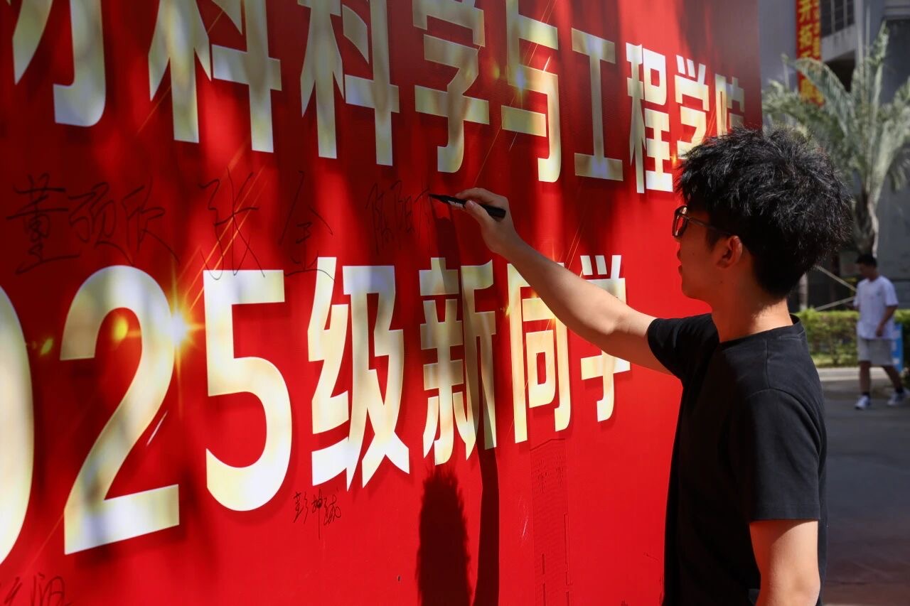 报到后的新生们纷纷驻足,或手持马克笔郑重写下自己的名字,或与同行的家长、新认识的同学并肩签名合影。每一个签名都是新生们对大学生活的郑重承诺,每一张合影都承载着初入校园的喜悦与期待。