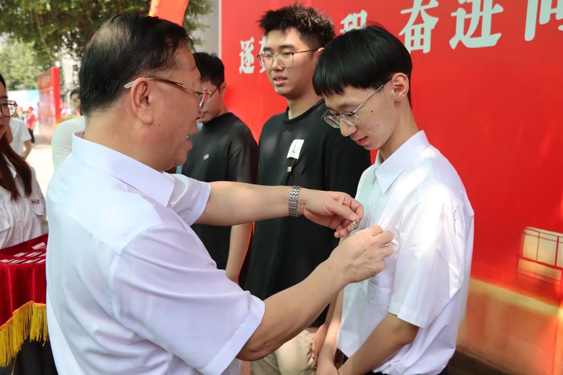 校党委陈国龙书记为成人动漫 新生代表佩戴校徽