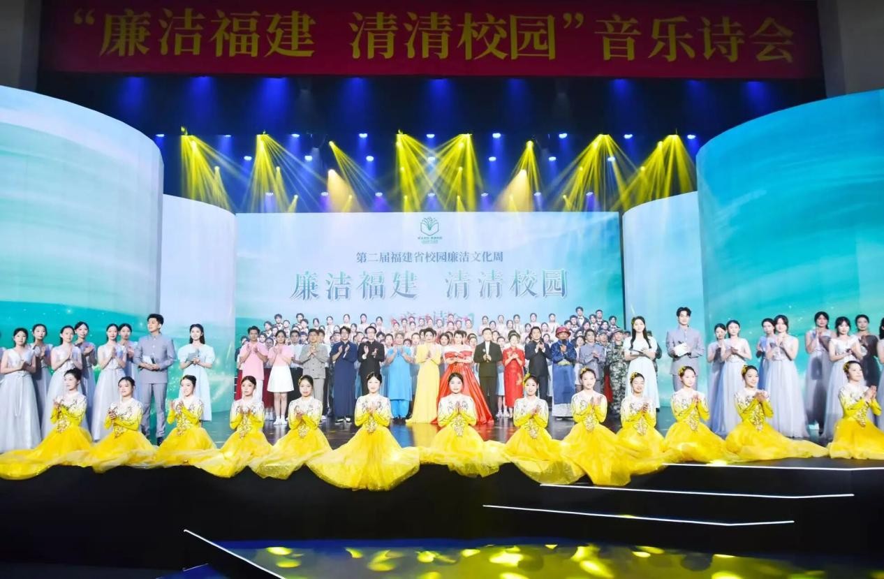 作为福建省校园廉洁文化周的核心活动,本次音乐诗会集歌、舞、剧、诵于一体,通过时空对话、沉浸式音诗画等形式,将廉洁元素转化为具象的舞台语言。省纪委监委、教育厅领导及全省14所高校师生代表等600余人于现场观演,共享这场廉洁文化的视听盛宴。