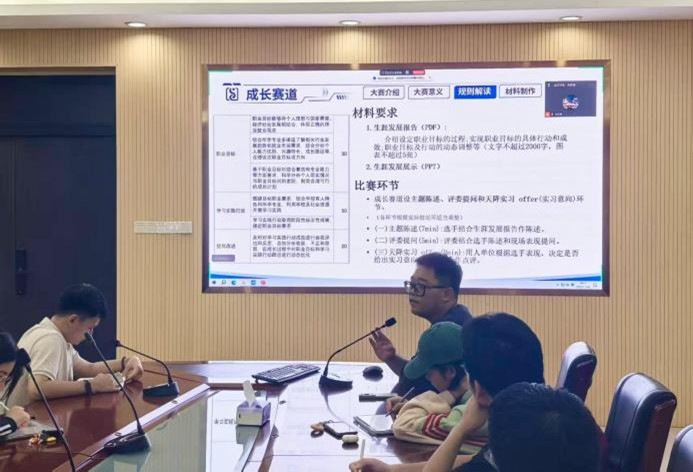 动员会上,吴锦瑄同学依据大赛相关文件,首先介绍了本次大赛“以赛促学、以赛促教、以赛促就”的核心目标及赛道设置、赛制体系等关键信息。针对成长赛道与就业赛道,他详细拆解了材料要求、比赛环节及评审标准,重点分享了如何依据评审规则完善润色材料的实用技巧。结合自身参赛经历,吴锦瑄同学提炼出“逻辑清晰、突出特色、视觉赋能”三大核心要点,强调参赛材料需兼具故事性与吸引力,才能打动评委。