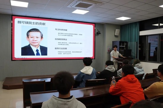 最后,他分享了以魏可镁院士为代表的勇于拼搏的奉献精神。魏可镁院士深耕科研一线,数十年如一日潜心钻研催化剂领域,始终以国家战略需求为导向,勇攀技术高峰,将毕生心血倾注于产业升级与学术突破,用实干与坚守诠释了新时代科研工作者的使命担当,为同学们树立了潜心科研、报国为民的精神标杆。