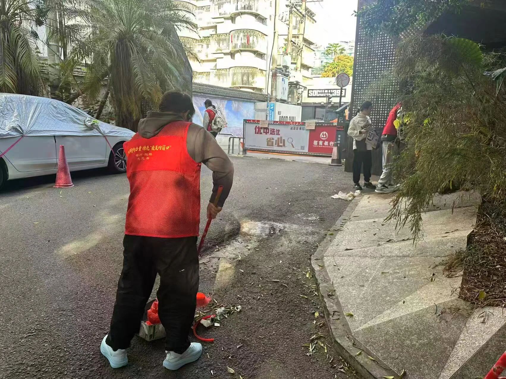 活动现场,一抹抹鲜亮的“志愿红”成为社区最动人的风景线。团支部成员们穿着统一志愿服装,携带扫帚、簸箕、垃圾桶等工具,在社区工作人员的指引下有序投入清洁工作。社区清洁组穿梭在花坛步道间,细致清理散落落叶、白色垃圾与杂物;护河行动组则聚焦于河道周边,俯身捡拾沿岸漂浮物、枯枝与散落杂物,合力清运垃圾,用双手还原河道水清岸绿的整洁风貌,切实改善社区生态环境。