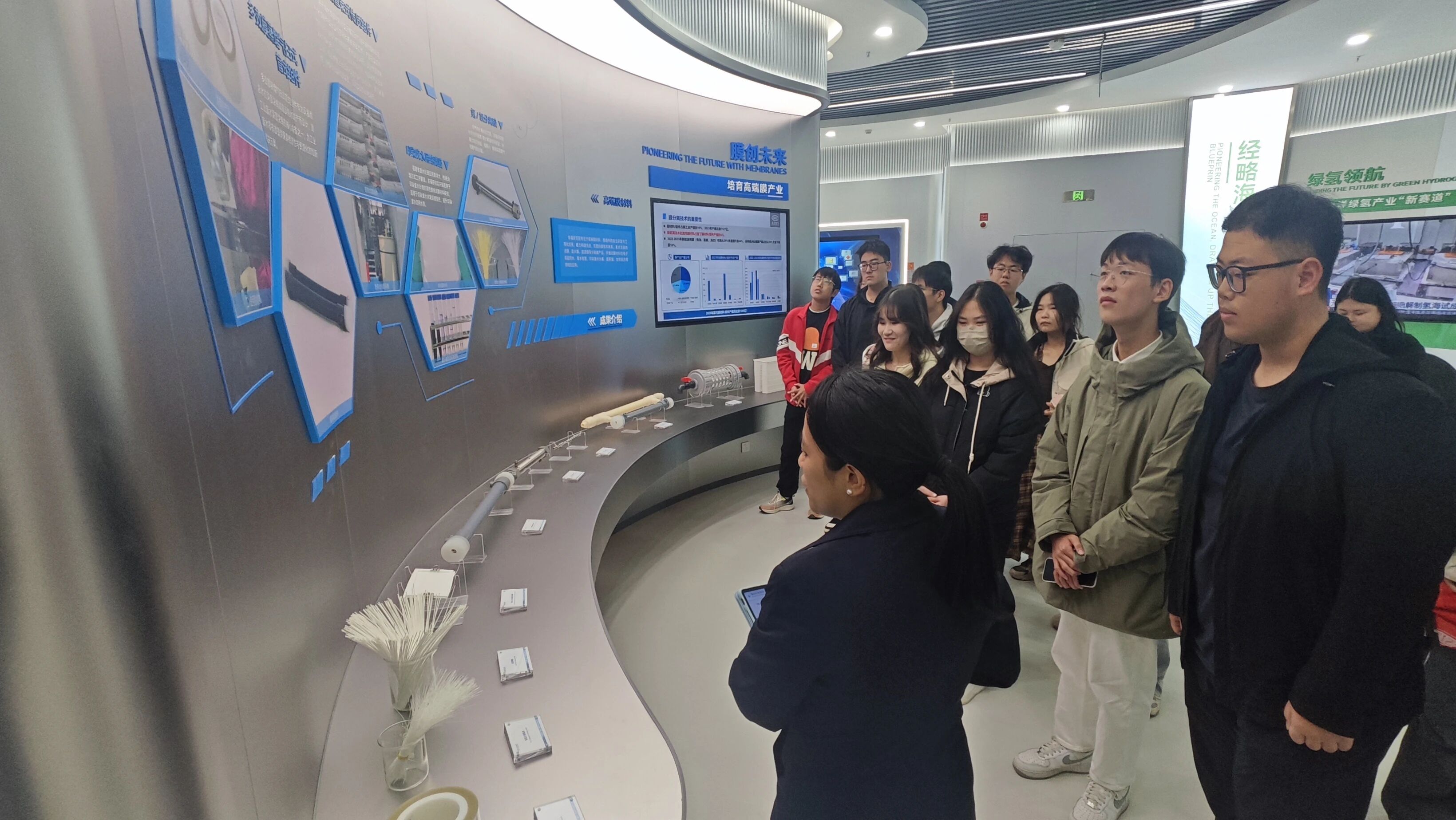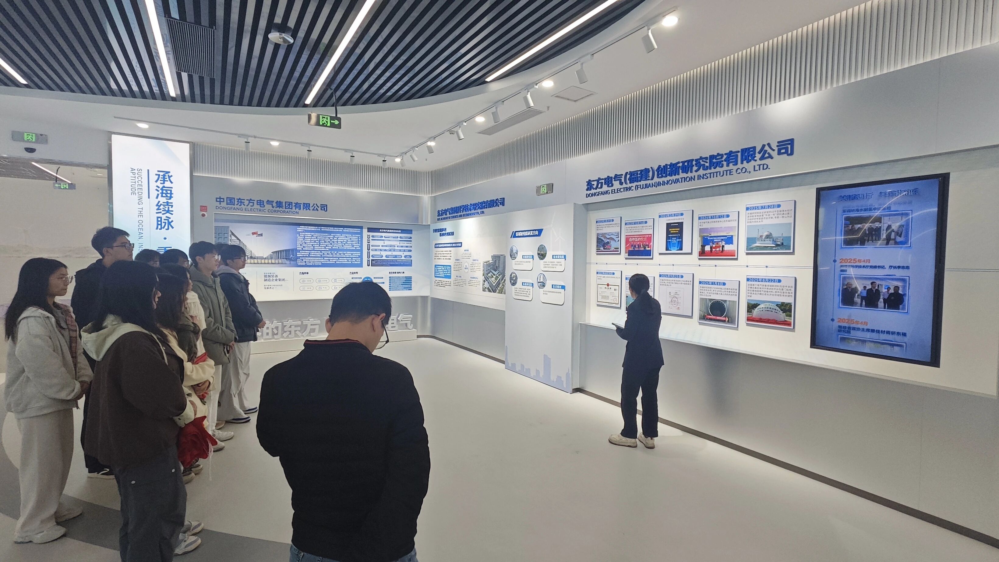 在专业讲解员的引导下,师生们先后参观了序厅、文化传承、科研实力、核心技术成果等多个展示区域。序厅内,国家战略保障相关指示与建设海洋科技强国的重要讲话,让同学们深刻领会研究院发展的时代背景与使命担当;文化传承区通过展现东方电气集团六十余载发展历程与东汽精神,彰显出国企的责任与担当。科研实力板块,谢和平、侯保荣等院士领衔的顶尖人才团队、7个细分领域研究所及20余项专利成果,直观呈现企业雄厚研发实力;核心技术展区里,海水无淡化原位直接电解制氢系统、17兆瓦漂浮式海上风电浮体、“东波1号”波浪能发电装置、国产化海洋防腐材料等前沿成果,从原理到应用的全景式展示,让同学们对材料技术的产业化形成具象认知。