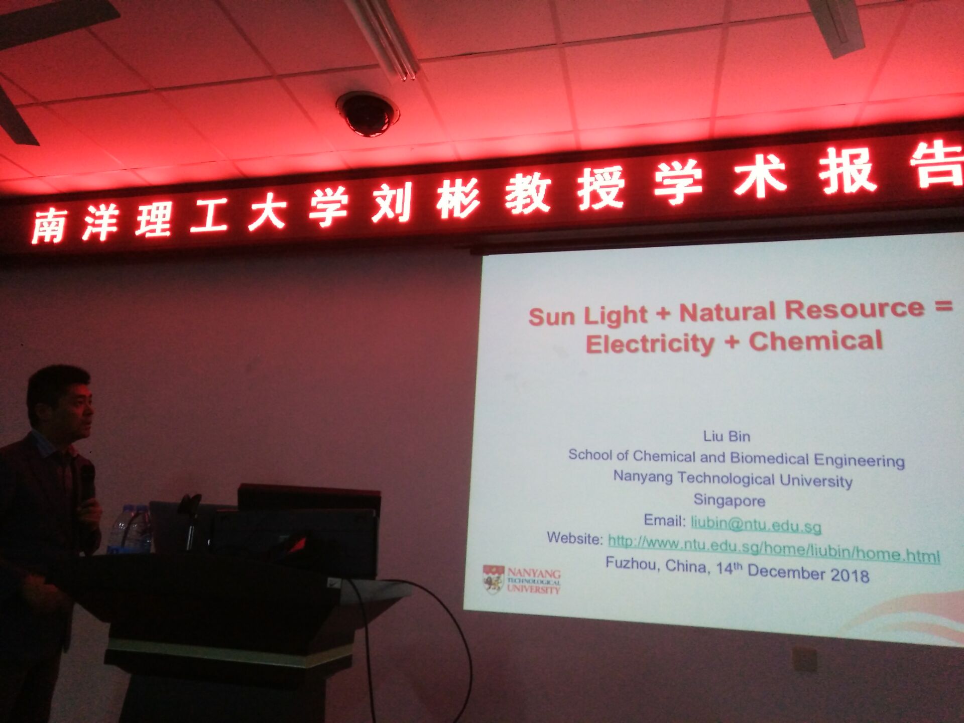 2018年12月24日,南洋理工大学刘彬教授应邀莅临材料科学楼404为成人动漫 师生带来题为“Sunlight + Natural Resource = Energy + Chemical”的学术报告。报告由成人动漫 “闽江学者”肖方兴教授主持。