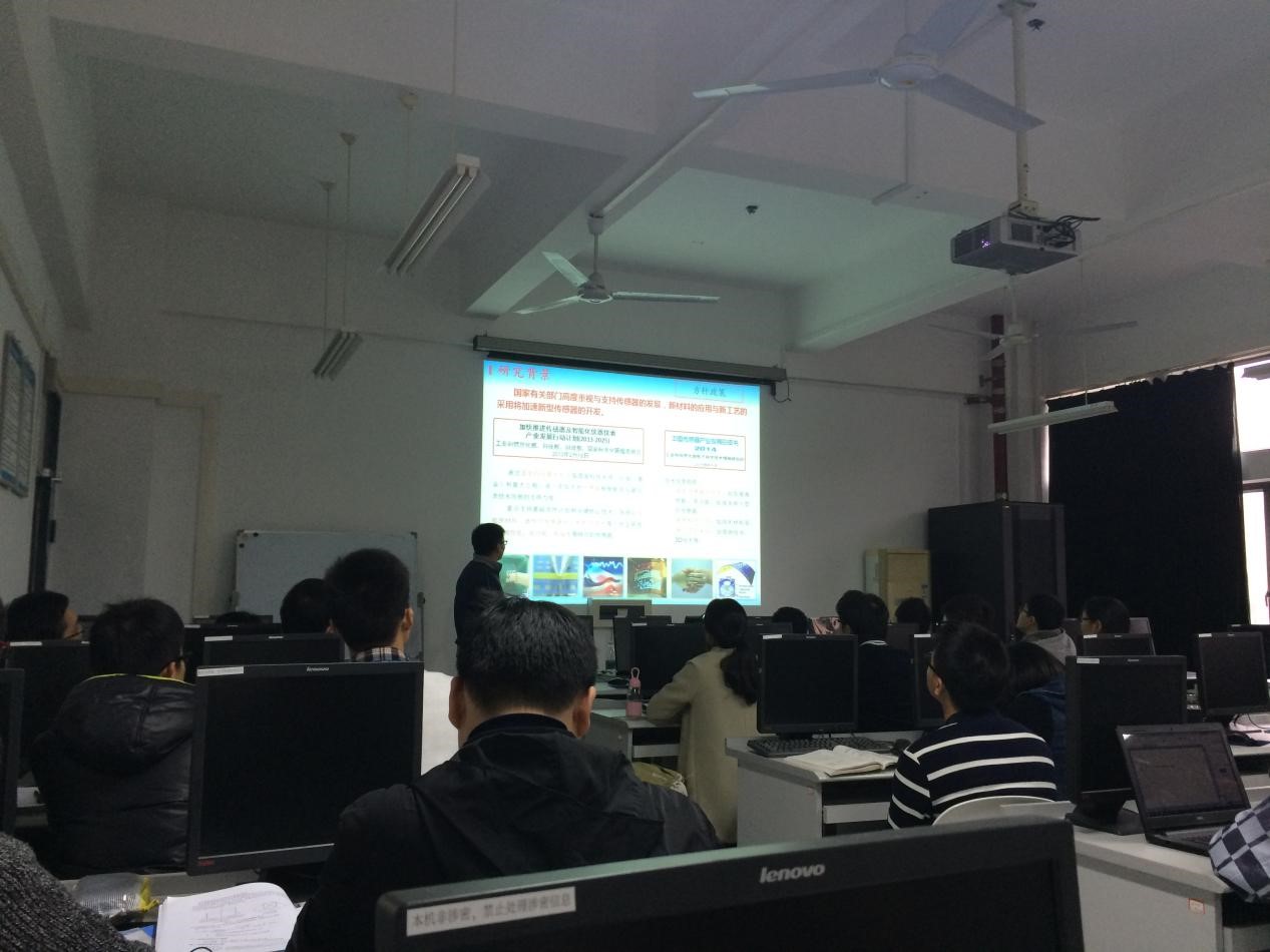 报告会上,廖新勤博士结合自身的实践经验和研究成果,在国家有关部门高度重视与支持传感器的发展,新材料的应用与新工艺的采用将加速新型传感器的开发的大背景下,讲述了加快推进传感器及智能化仪器仪表产业发展行动计划和中国传感器产业发展白皮书。然后分别以自身实验为例,生动翔实地介绍了ZnO纳米线/MgO隧穿层结构高开关比压力传感器研究、ZnO纳米线@聚氨酯纤维结构延展性多功能传感器研究、微纳米石墨片纤维基柔性应变传感器研究和金纳米颗粒@纸基柔性可剪切防水应变传感器研究。最后,廖新勤博士作为福大校友与本科导师吴波进行了学术上的深入探讨。